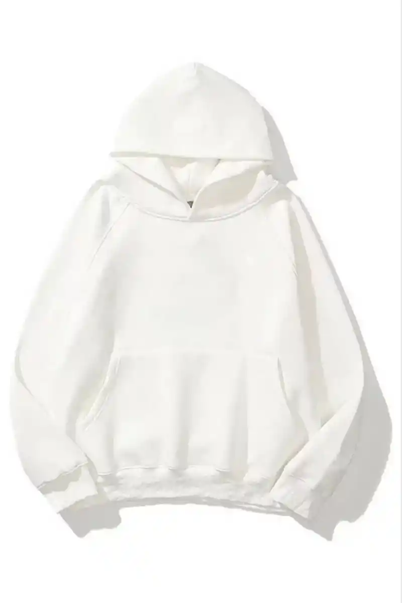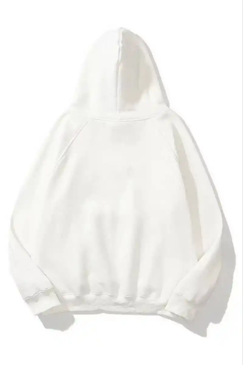 3 İplik Pamuklu Unisex Kapşonlu Sweetshirt - Beyaz