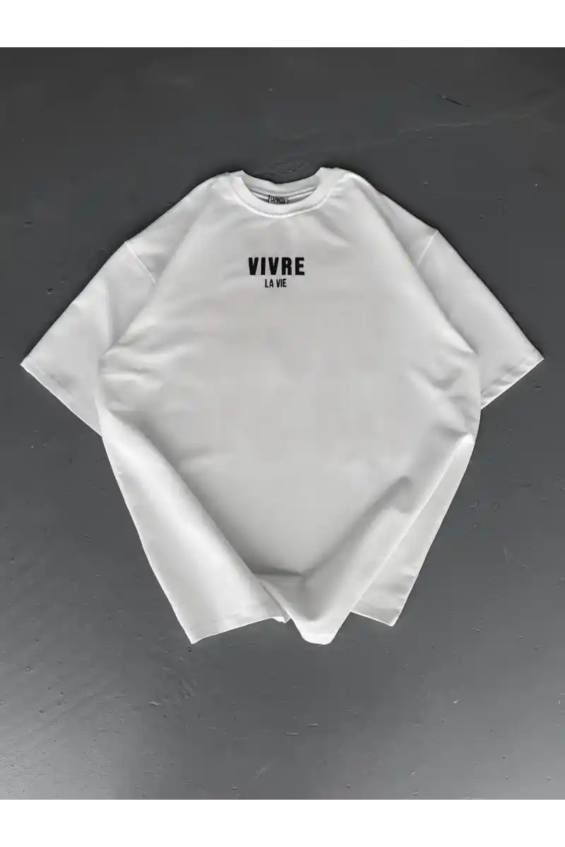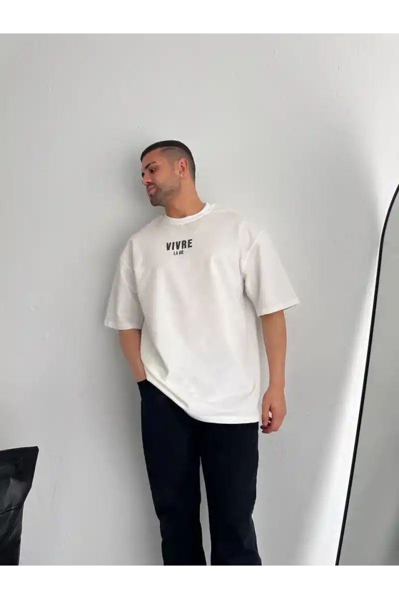Baskılı Oversize Bisiklet Yaka T-shirt - Beyaz