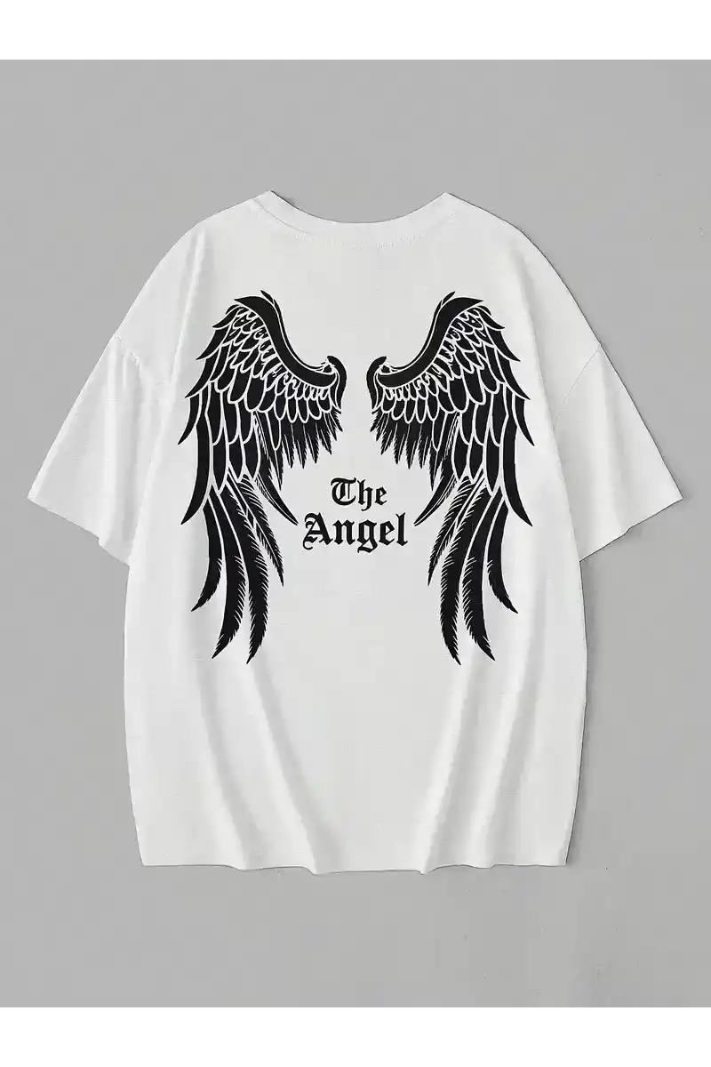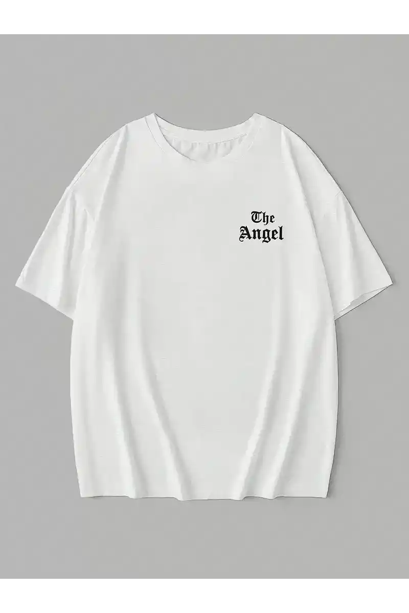 20/1 Penye Compack Dark Angel Baskılı Oversize Kısa Kol Yazlık T-shirt- Beyaz