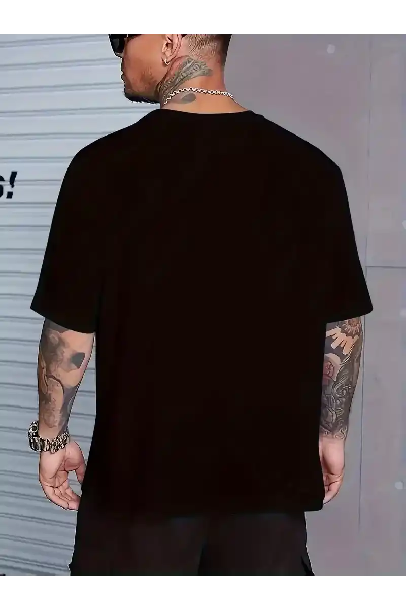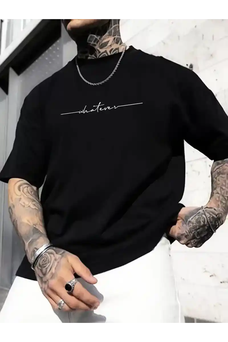 Büyük Beden Erkek "Whatever" Baskılı Tişört, Oversize Erkekler İçin Yaz Modası Kısa Kollu Tişörtler - Siyah