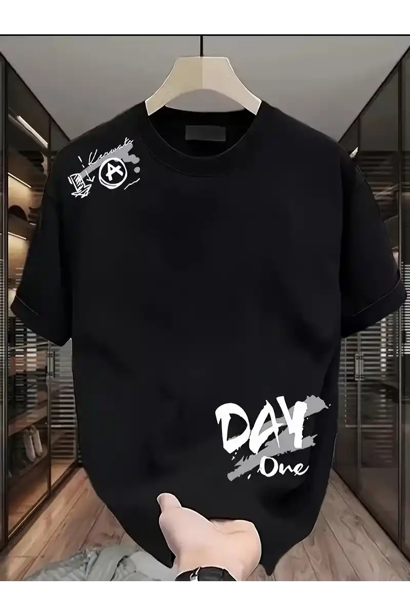 20/1 Penye Compack Day One Baskılı Oversize Bisiklet Yaka T-shirt - Siyah