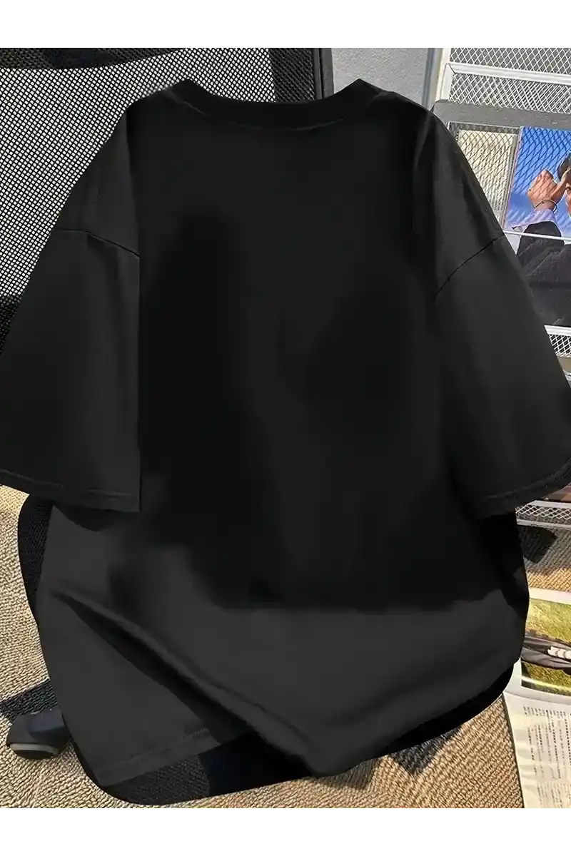 [Günlük T-Shirt] Hafif Kadın Günlük T-Shirt | Bol Kesim, Kısa Kollu, Yuvarlak Yaka, Eğlenceli Karikatür Ayı ve "Umrumda Değil" Baskı - Günlük Stil, İlkbahar/Yaz- Siyah