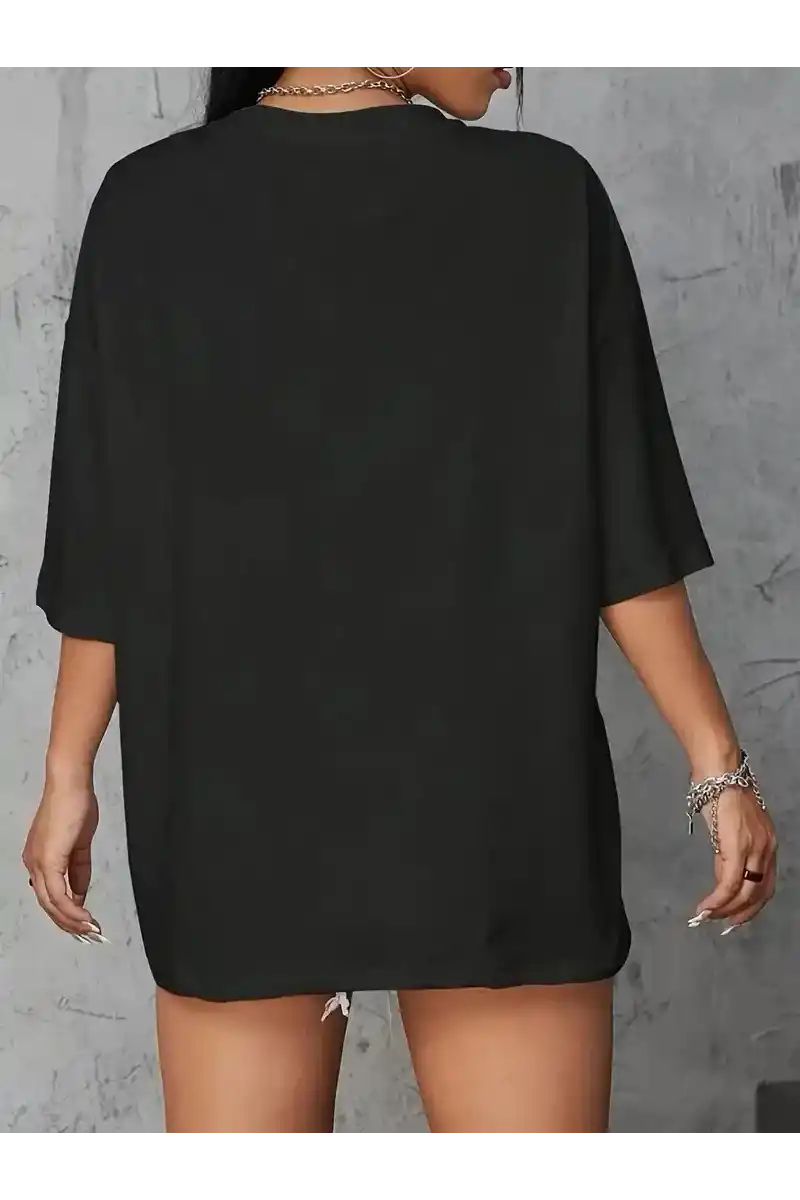 20/1 Penye Compack Baskılı Oversize Kahve Desenli Kadın Kısa Kol Yazlık T-shirt - Siyah