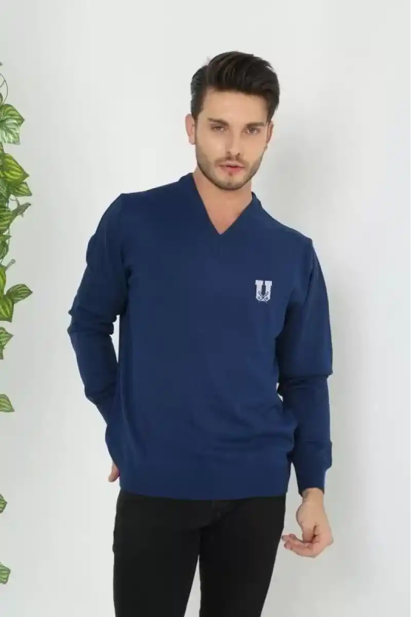 Baskılı V Yaka Uzun Kol Dokuma Triko - Indigo
