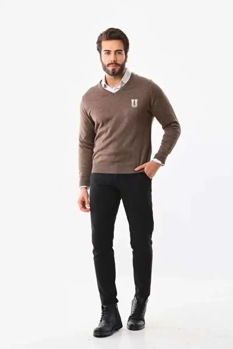 Baskılı V Yaka Uzun Kol Dokuma Triko - Kahve