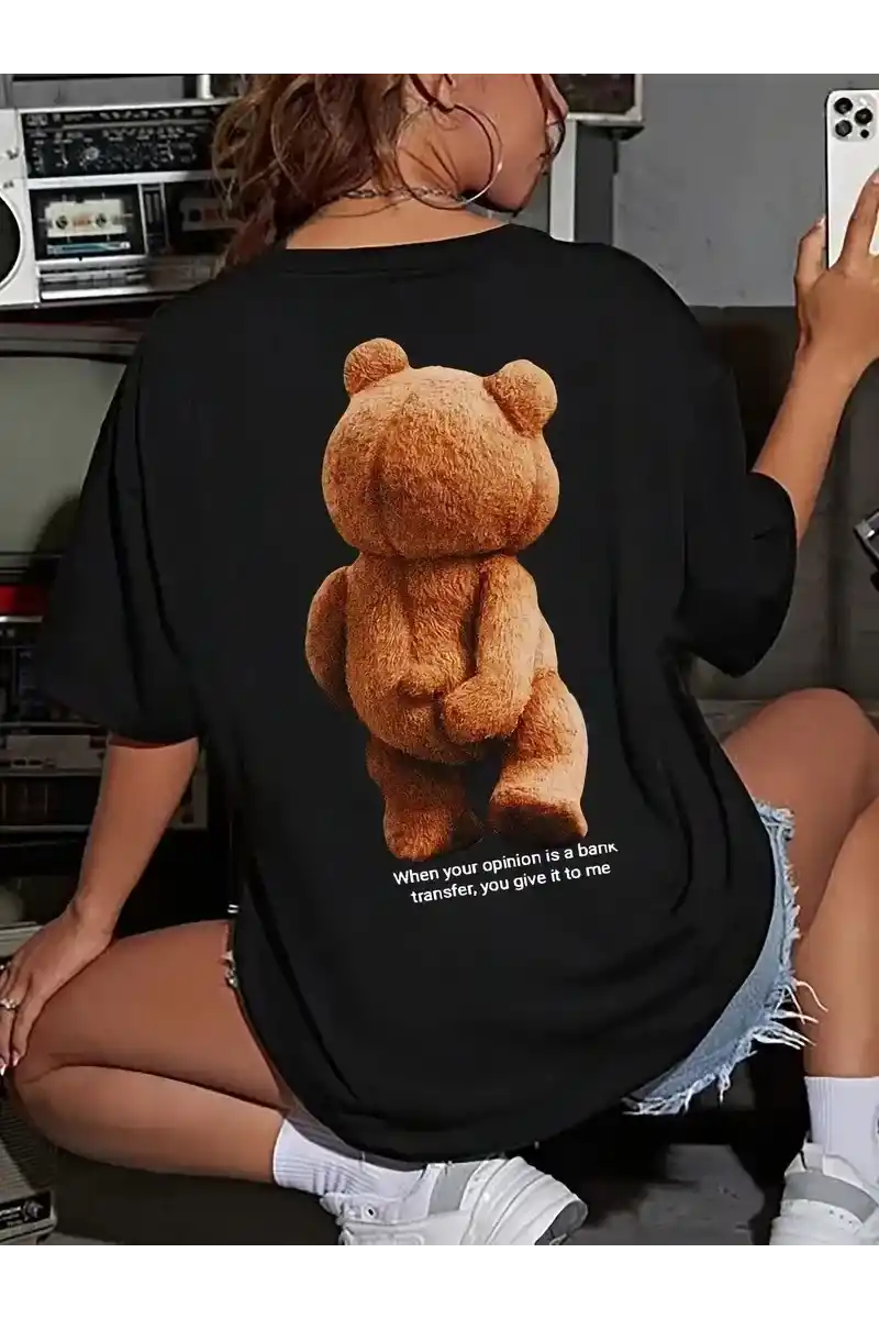Büyük Boy Ayıcık Baskılı Bisiklet Yaka T-Shirt, İlkbahar & Yaz İçin Rahat Kısa Kollu T-Shirt, Kadın Giyim - Siyah