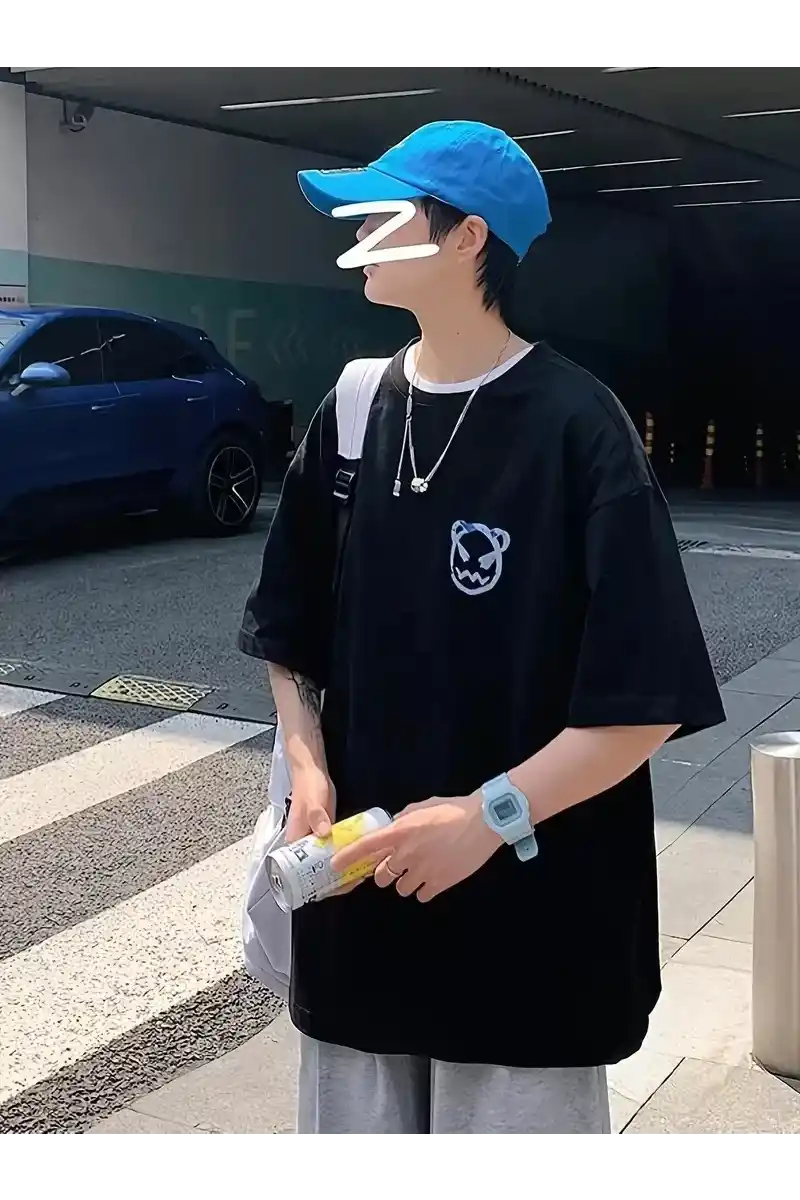 20/1 Penye Compack Bisiklet Yaka Kore tarzı sevimli ayı baskı Kısa Kol Erkek t-shirt - Siyah