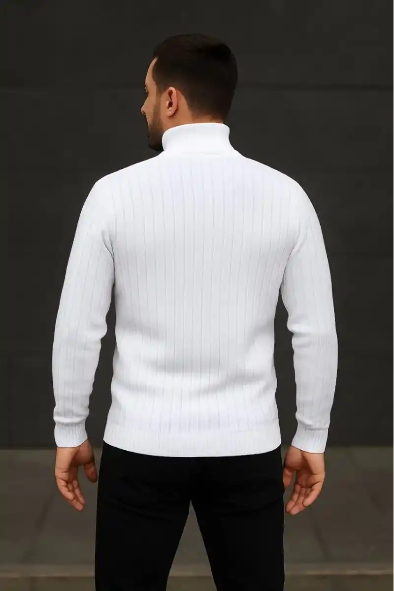 Erkek Balıkcı Yaka Bağazlı Triko Kazak Pamuklu Kalın Fitilli Dokuma, Regular Fit Uzun Kollu Kışlık Model - Beyaz