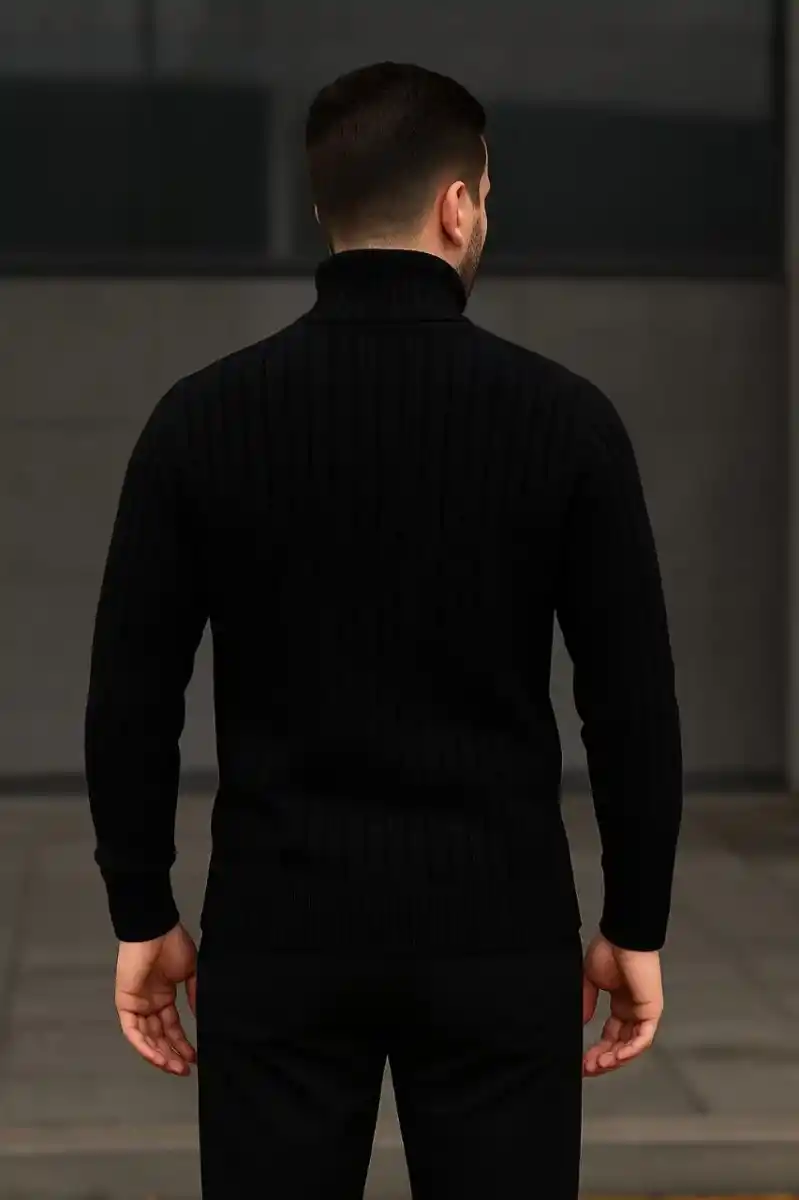 Erkek Balıkcı Yaka Bağazlı Triko Kazak Pamuklu Kalın Fitilli Dokuma, Regular Fit Uzun Kollu Kışlık Model - Siyah