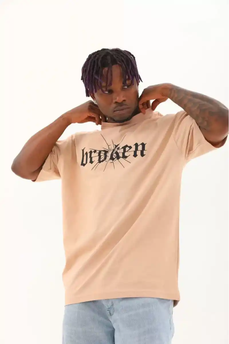 Unisex Oversize Baskılı Bisiklet Yaka T-Shirt - Bej