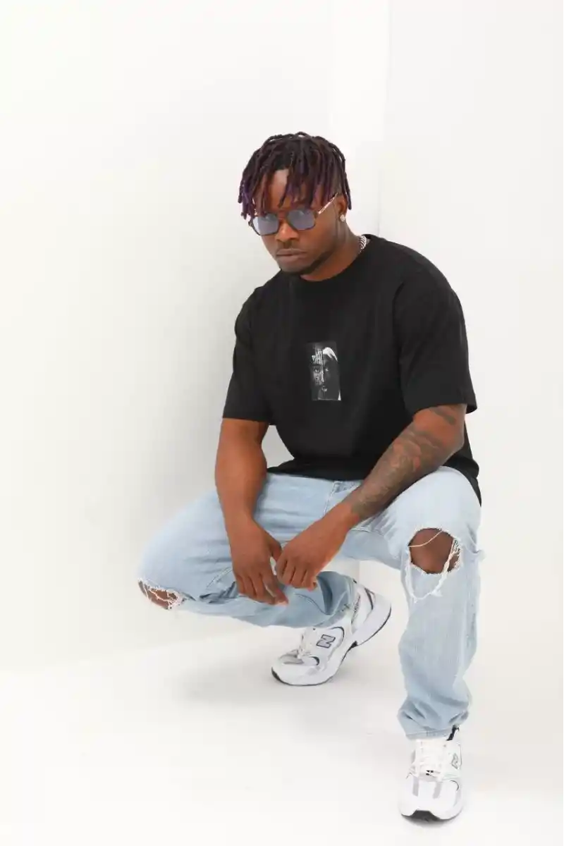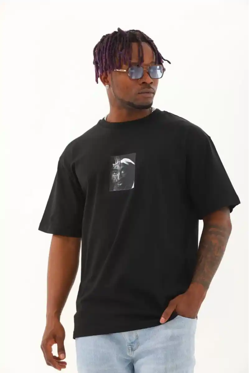 Unisex Oversize Baskılı Bisiklet Yaka T-Shirt - Siyah