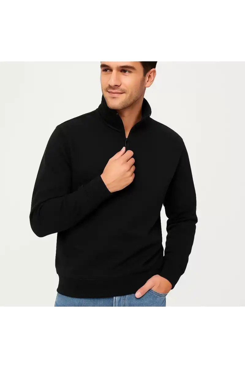 Erkek Dik Yaka Sweatshirt Dik Yaka Yarım Fermuarlı 3 İplik Şardonlu Pamuk Kumaş - Siyah