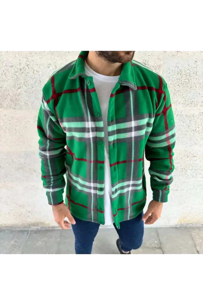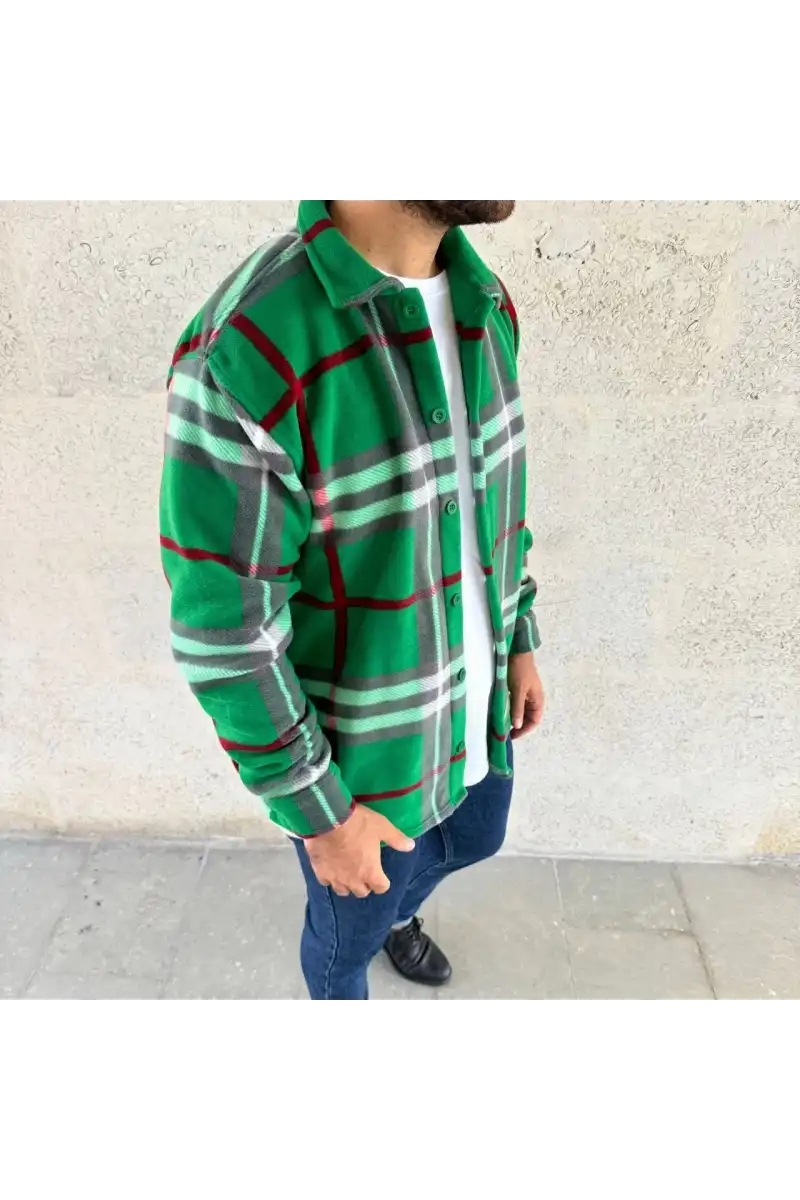 Erkek Ekose Desenli Düğmeli Polar Yakalı Uzun Kollu Gömlek Oversize Rahat Kalıp - Yeşil