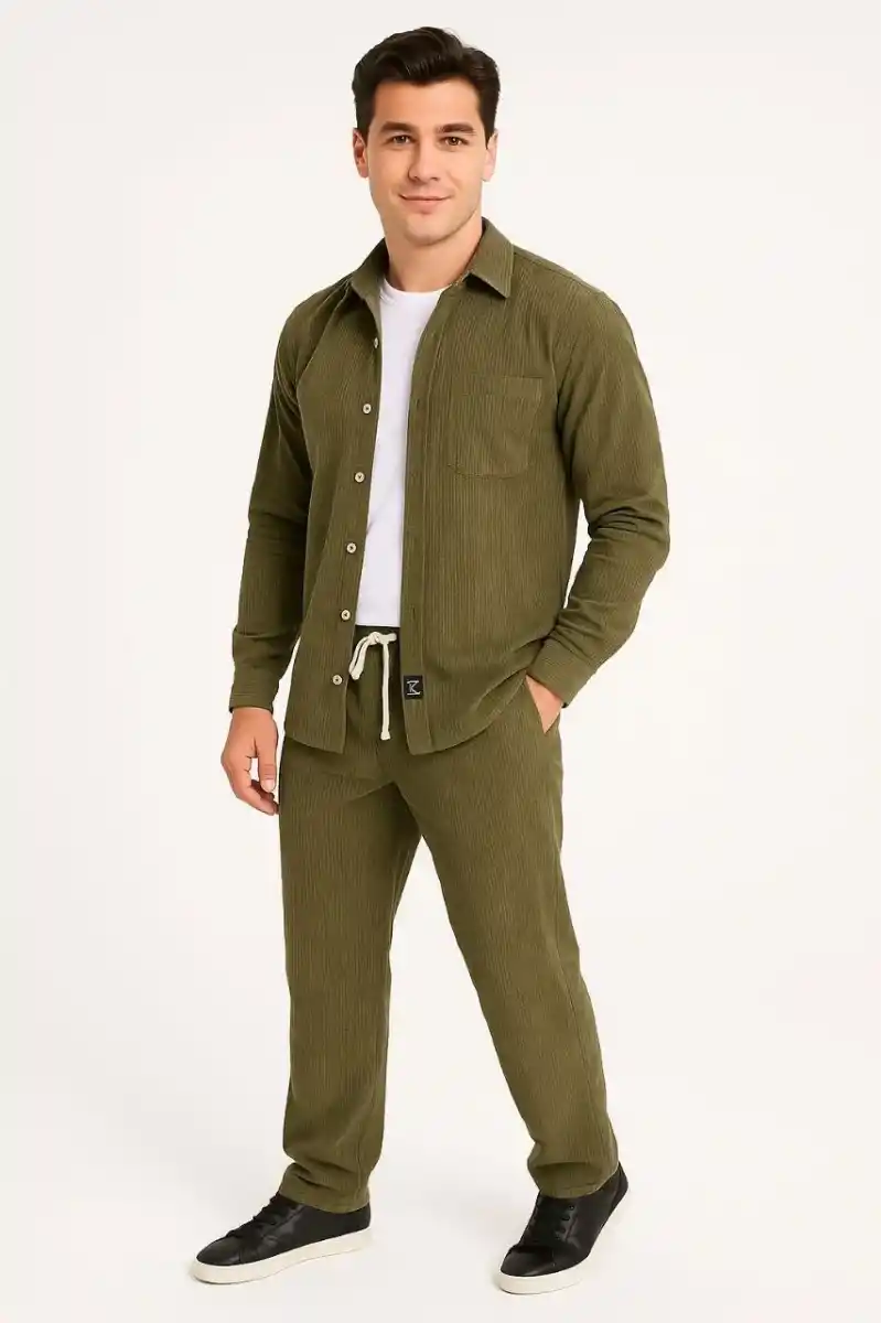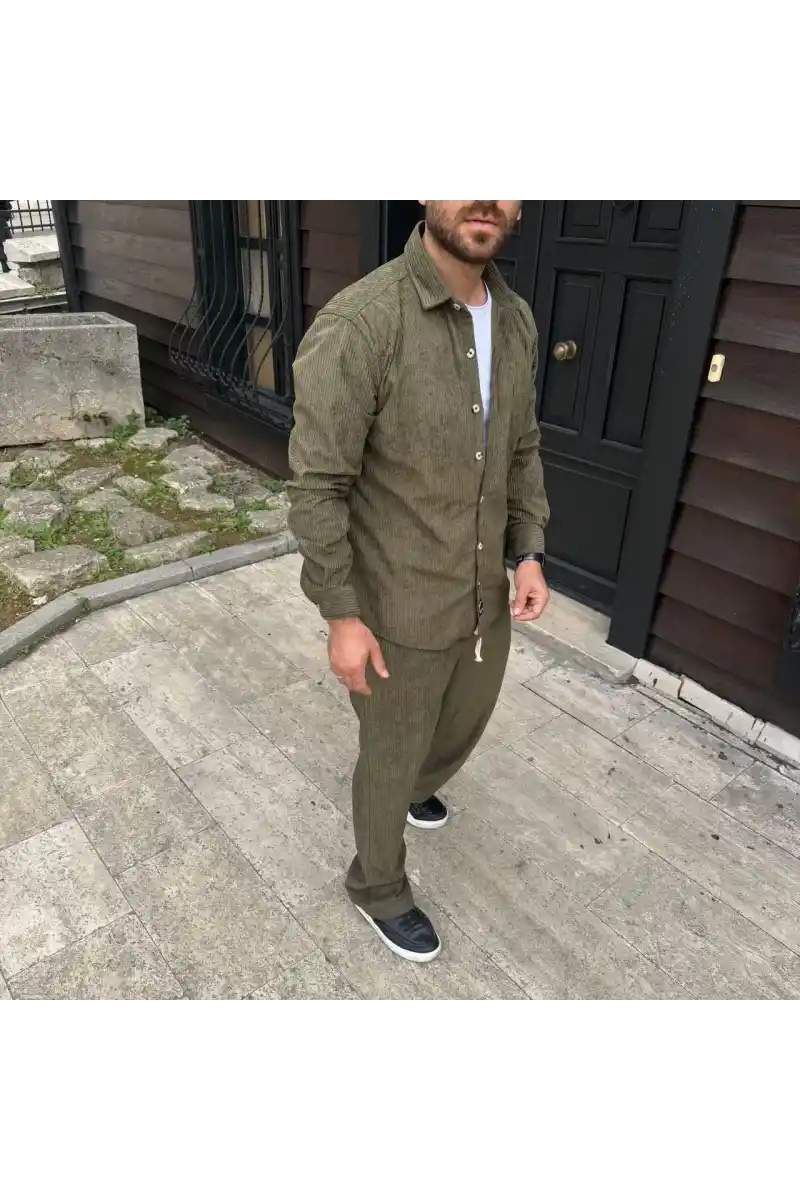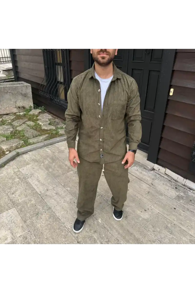 Erkek Kadife Oversize Takım – Gömlek ve Pantolon İkili Set Füme Corduroy Şıklığı, Rahat ve Zarif Duruş Yumuşak Dokulu Kadife Kumaş, Düğmeli Gömlek Üst ve Lastikli Pantolon Alt Parça ile Gün Boyu Konfor- Haki