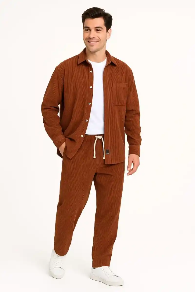 Erkek Kadife Oversize Takım – Gömlek ve Pantolon İkili Set Füme Corduroy Şıklığı, Rahat ve Zarif Duruş Yumuşak Dokulu Kadife Kumaş, Düğmeli Gömlek Üst ve Lastikli Pantolon Alt Parça ile Gün Boyu Konfor- Kiremit