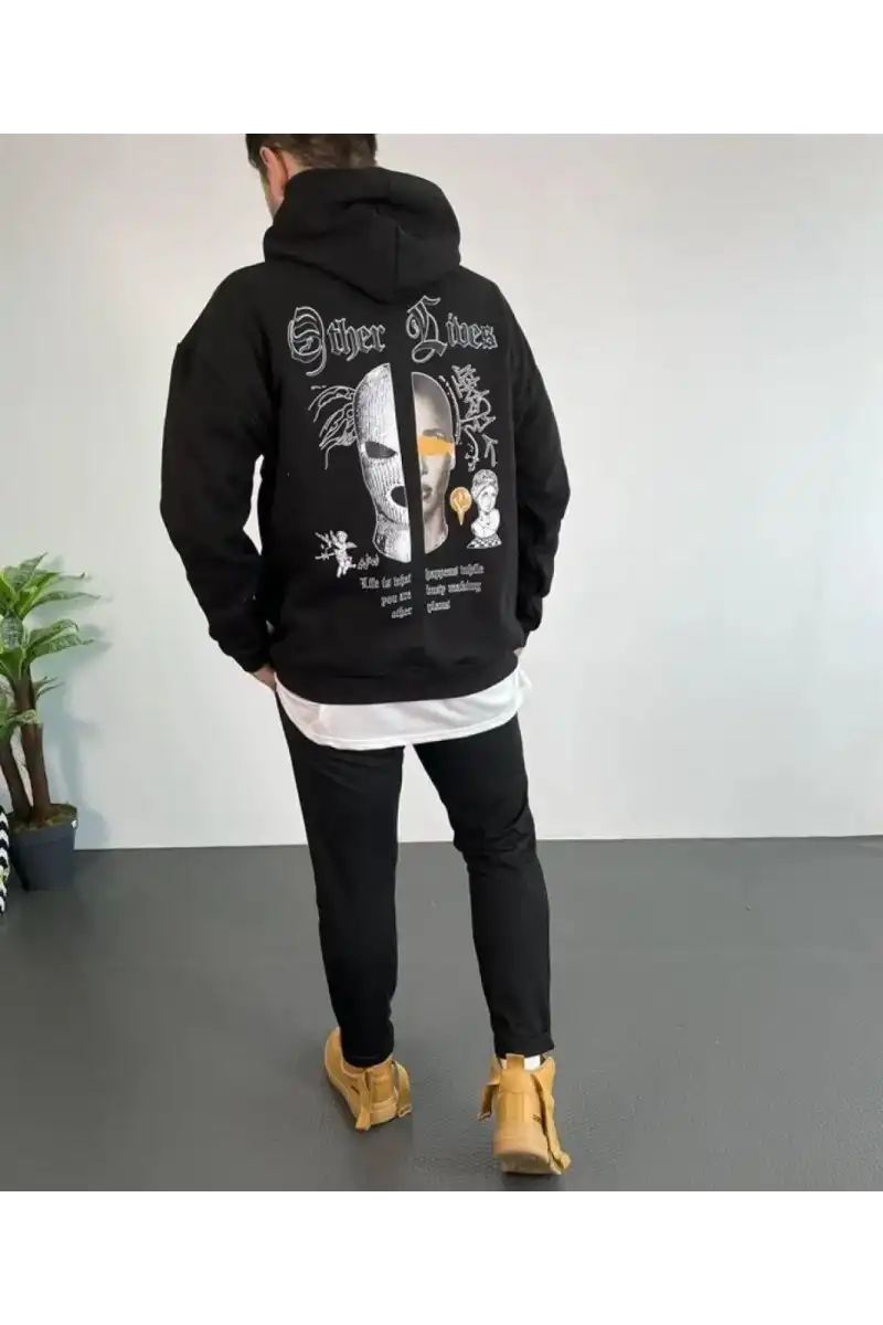 Erkek Kapşonlu Sweatshirt – Oversize Üç İplik Şardonlu Hoodie, “Other Lives” Ön & Arka Baskılı, Kanguru Cepli, Kışlık Rahat Günlük Stil - Siyah