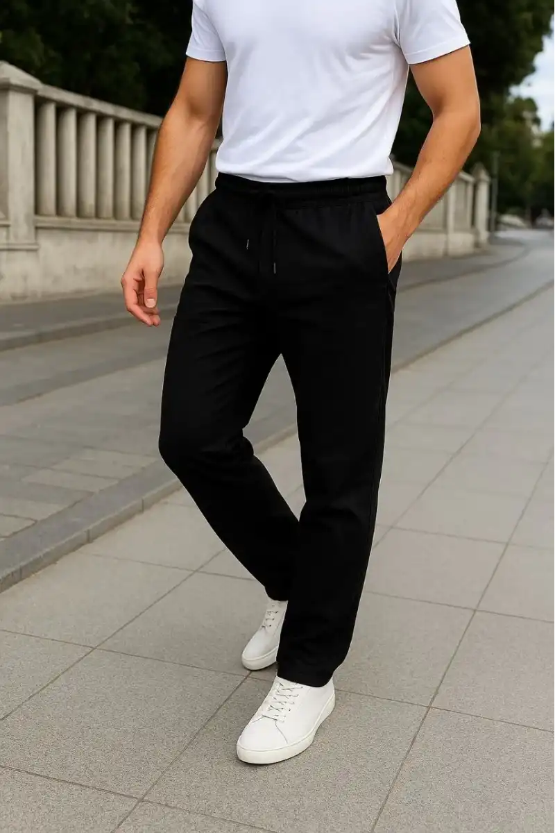 Erkek Keten Pantolon – Cepli, Beli Lastikli ve Bağcıklı, Nefes Alan Rahat Kalıp, Yazlık ve Baharlık Günlük Giyim, Şık & Konforlu Boru Paça Model - Siyah