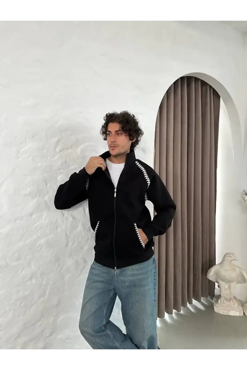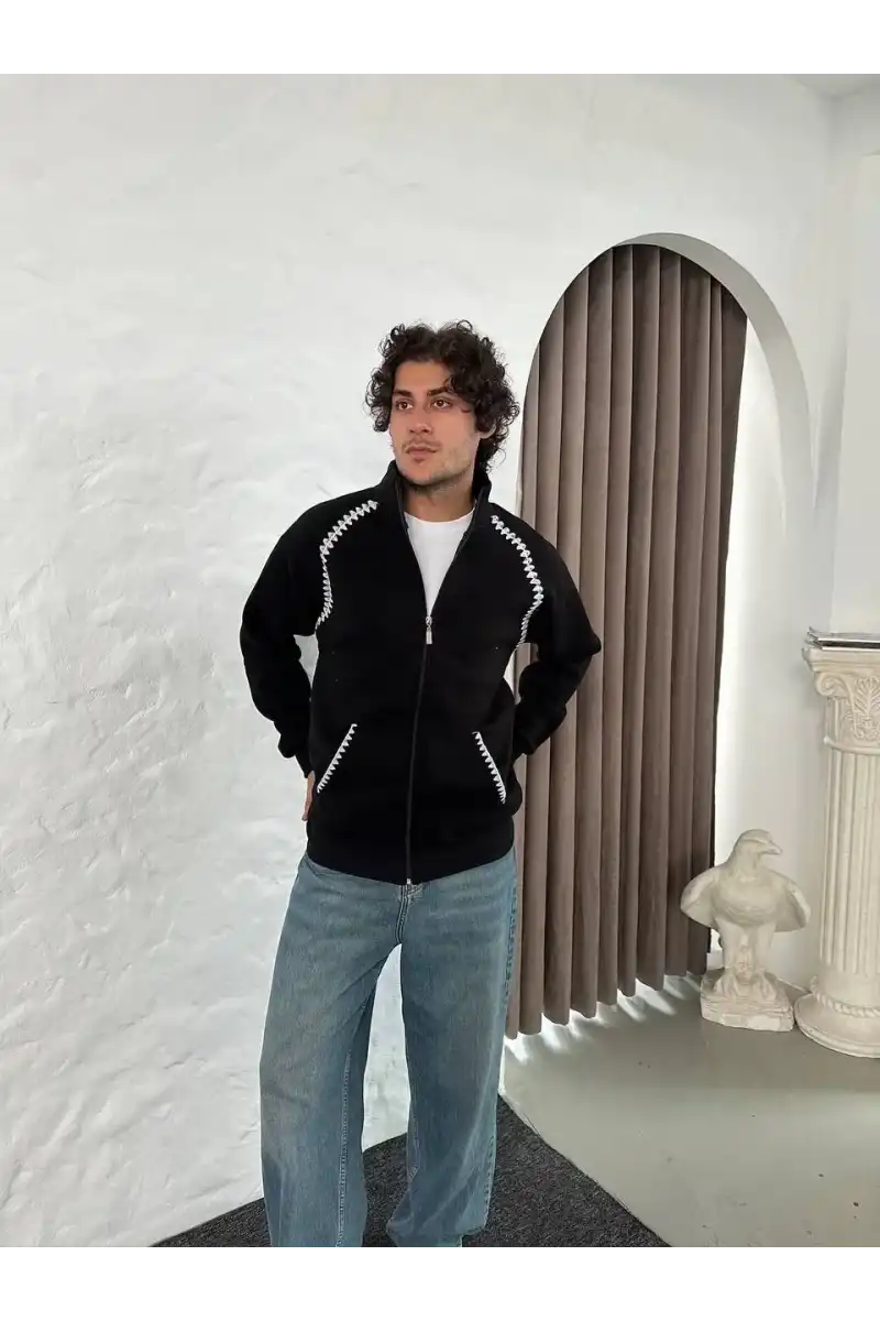 Erkek Oversize Dik Yaka Fermuarlı Sweatshirt - Zincir Nakışli Kanguru Cepli - Siyah