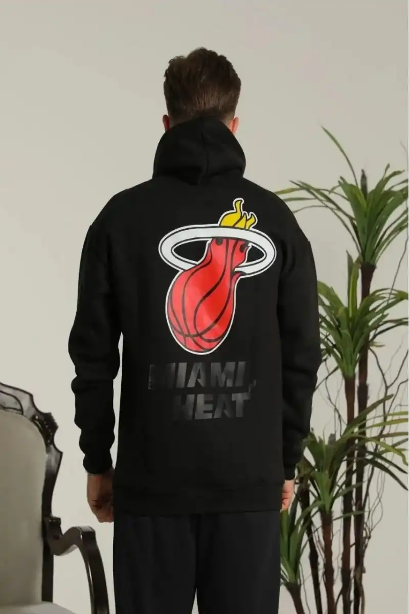 Erkek Oversize Üç İplik Kapüşonlu Sweatshirt –Sırt ve Ön Baskılı, Kanguru Cepli, Rahat Kalıp Maskot Desenli Model - Siyah