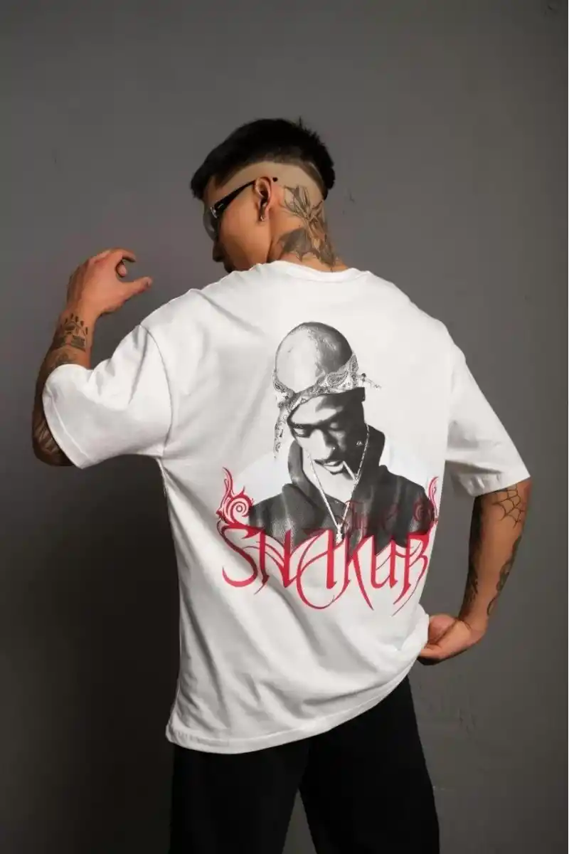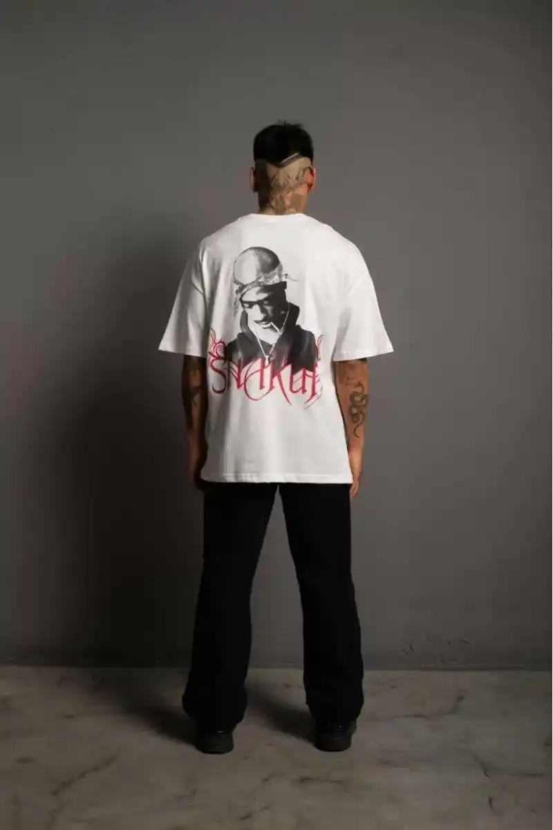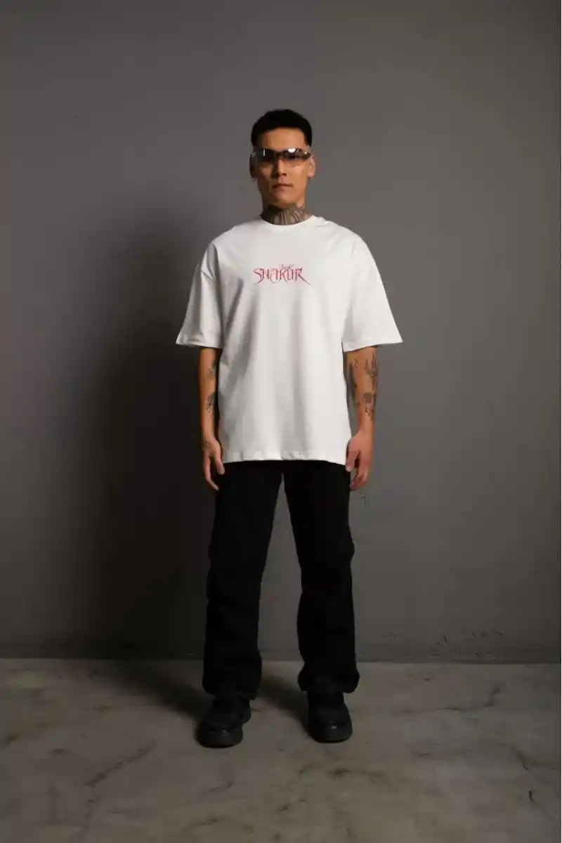 Erkek Oversize Tişört – Beyaz 24/1 Penye Kumaş, Bisiklet Yaka, Ön & Arka Baskılı, Streetwear Tarzı Rahat Büyük Kalıp T-Shirt- Beyaz
