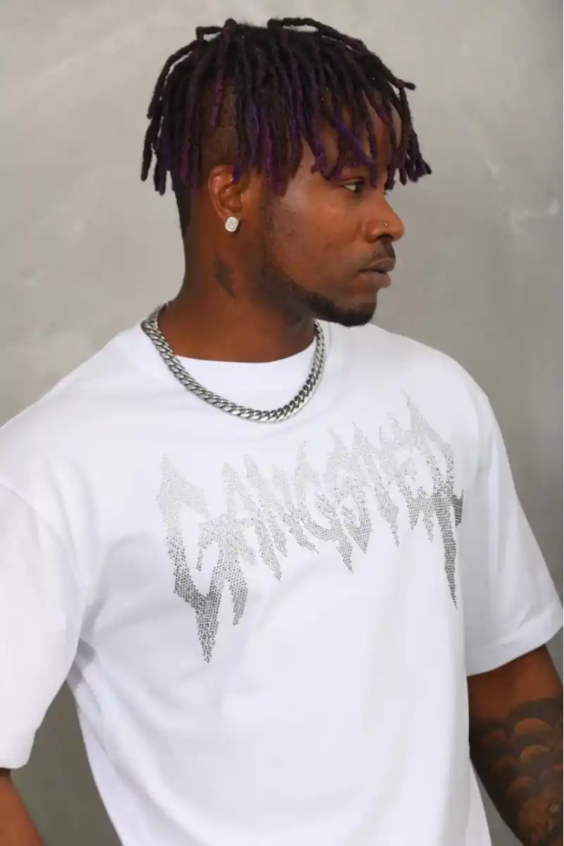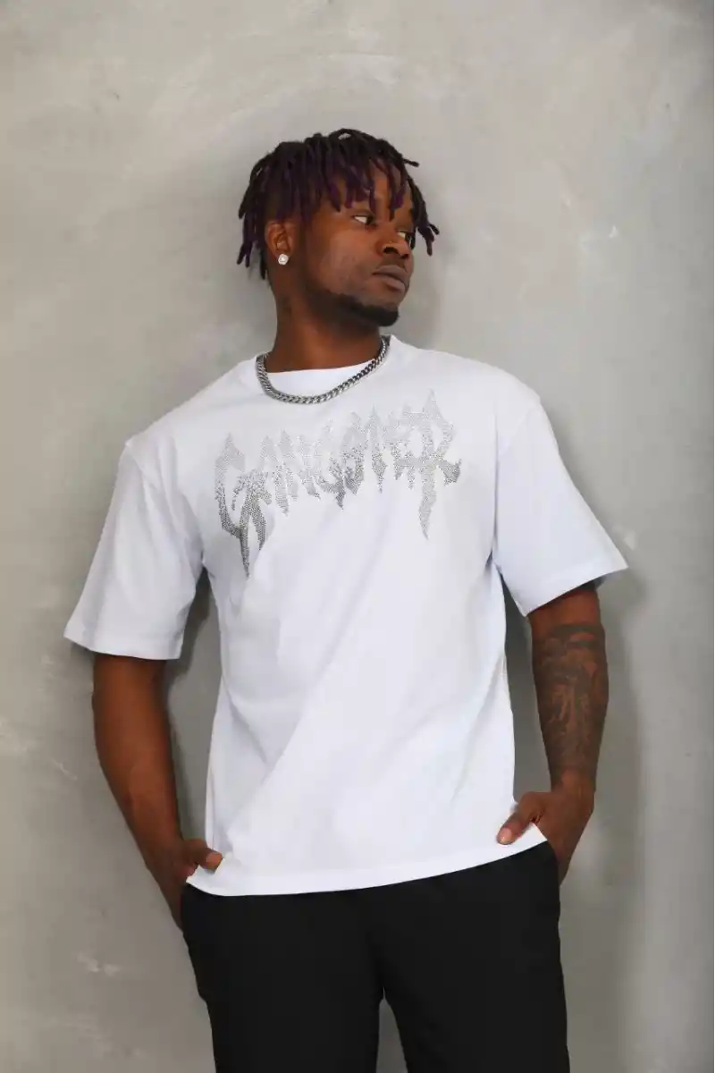 Unisex Oversize Taşlı Bisiklet Yaka T-Shirt - Beyaz