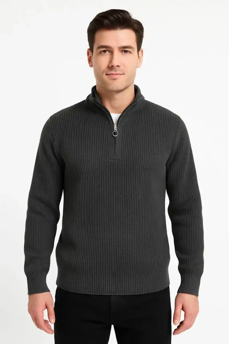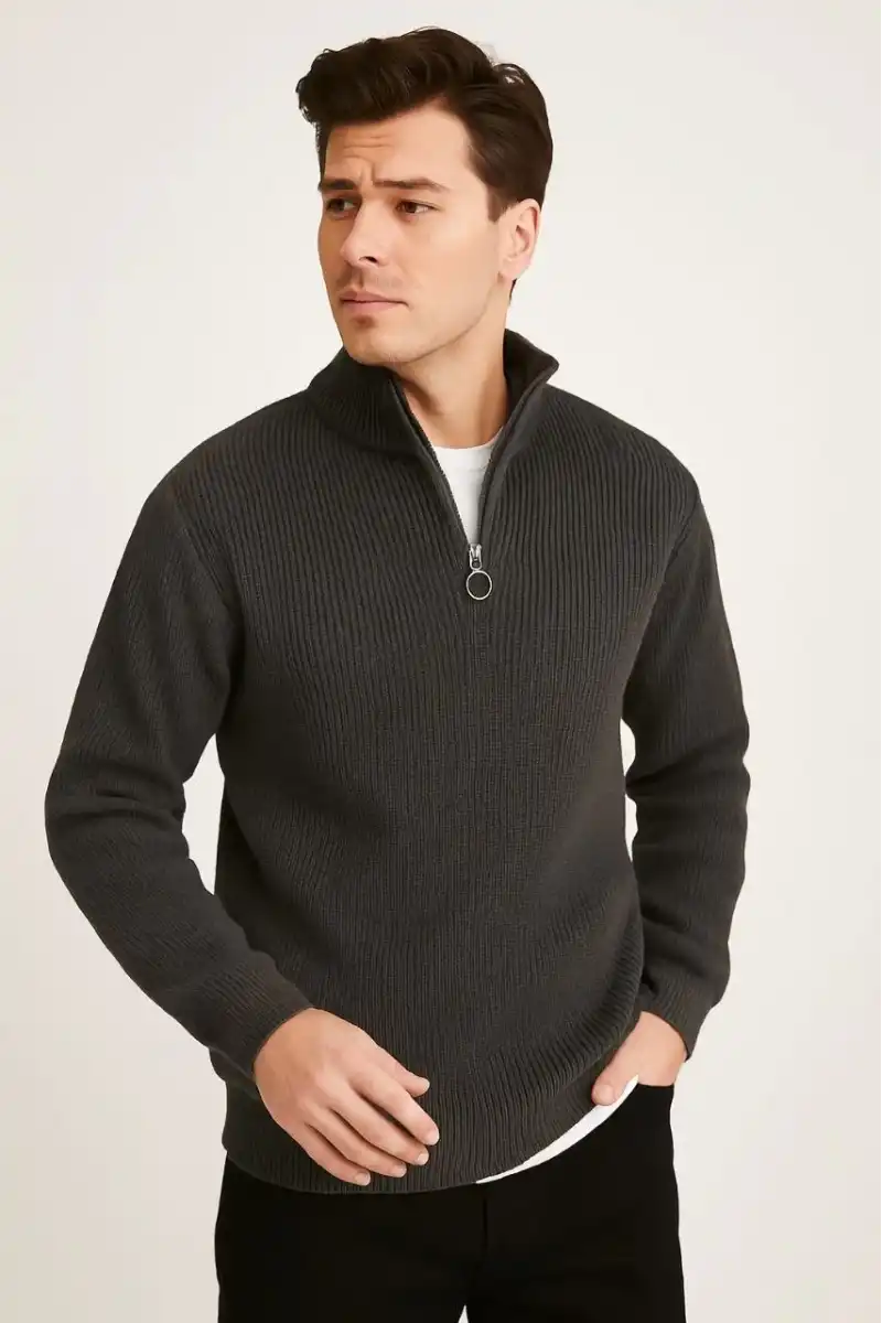 Erkek Yarım Fermuarlı Triko Kazak – Selanik Örgü, Dik Yaka, Pamuklu Dokuma, Regular Fit Uzun Kollu Kışlık Model - Füme