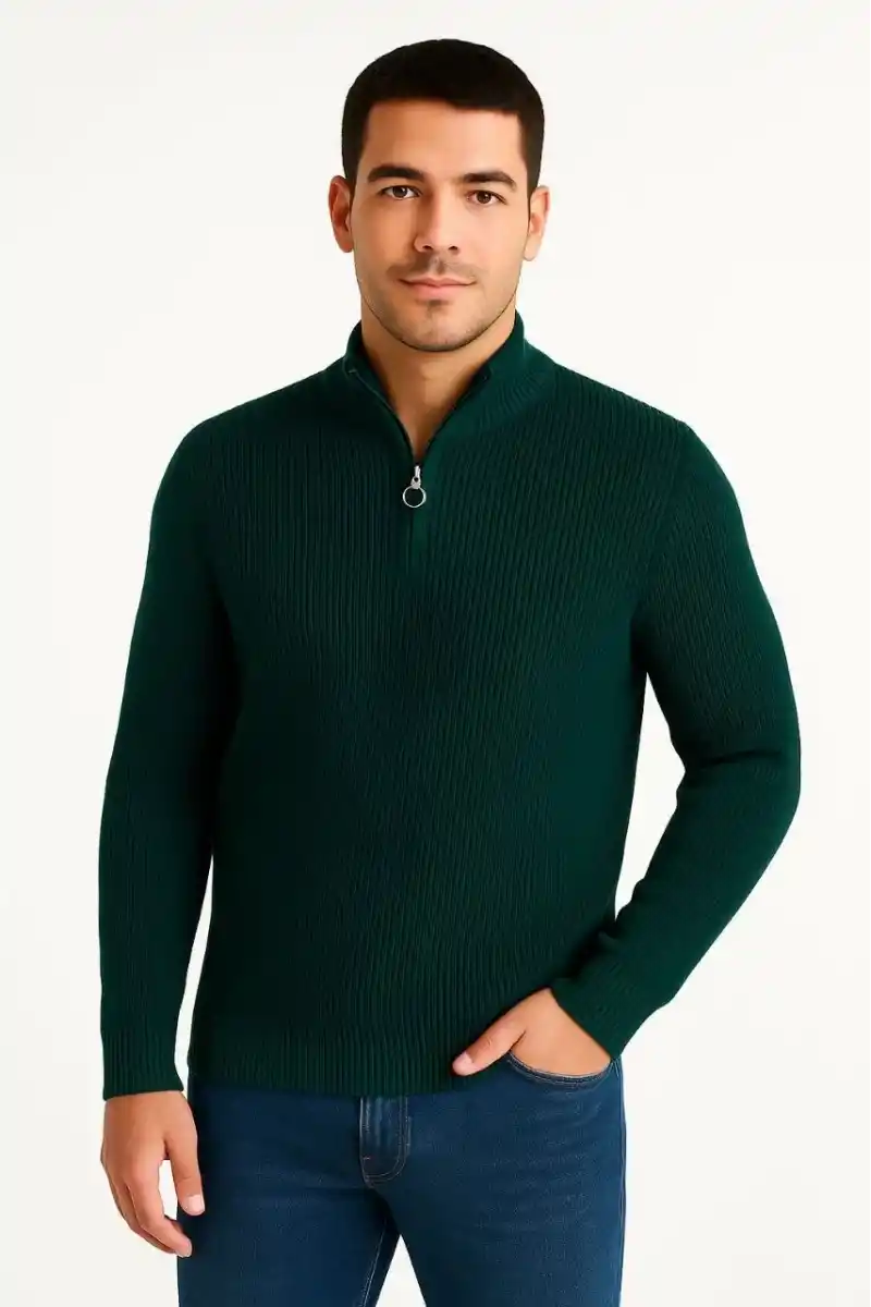Erkek Yarım Fermuarlı Triko Kazak – Selanik Örgü, Dik Yaka, Pamuklu Dokuma, Regular Fit Uzun Kollu Kışlık Model - Haki