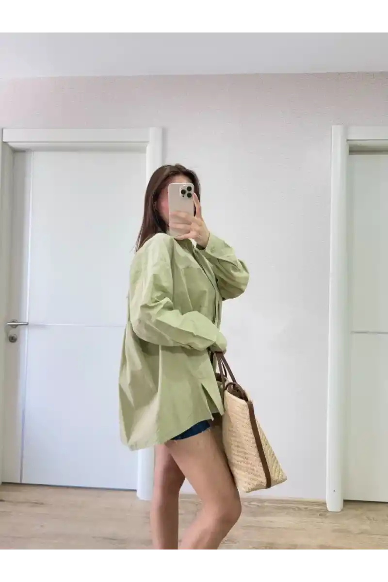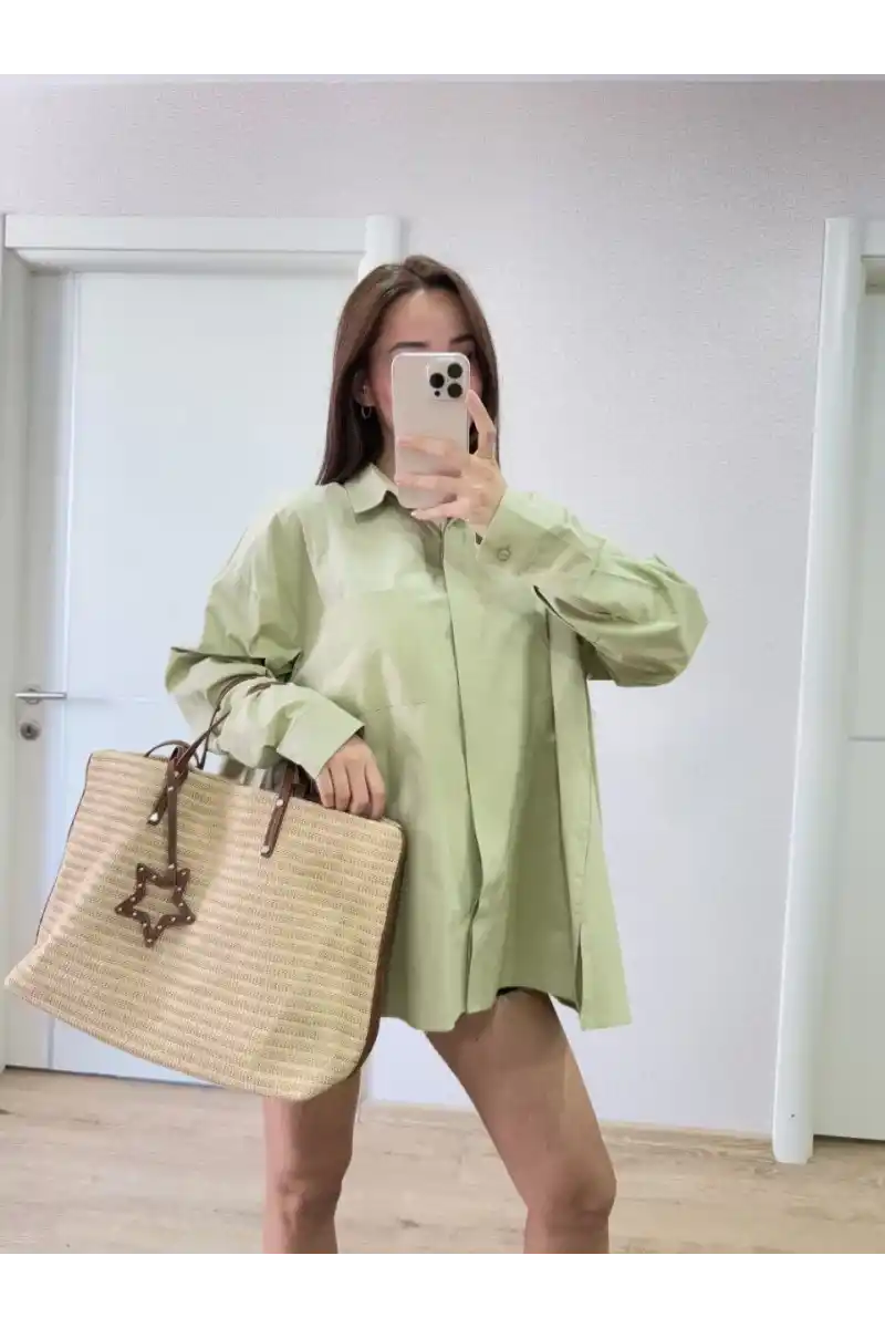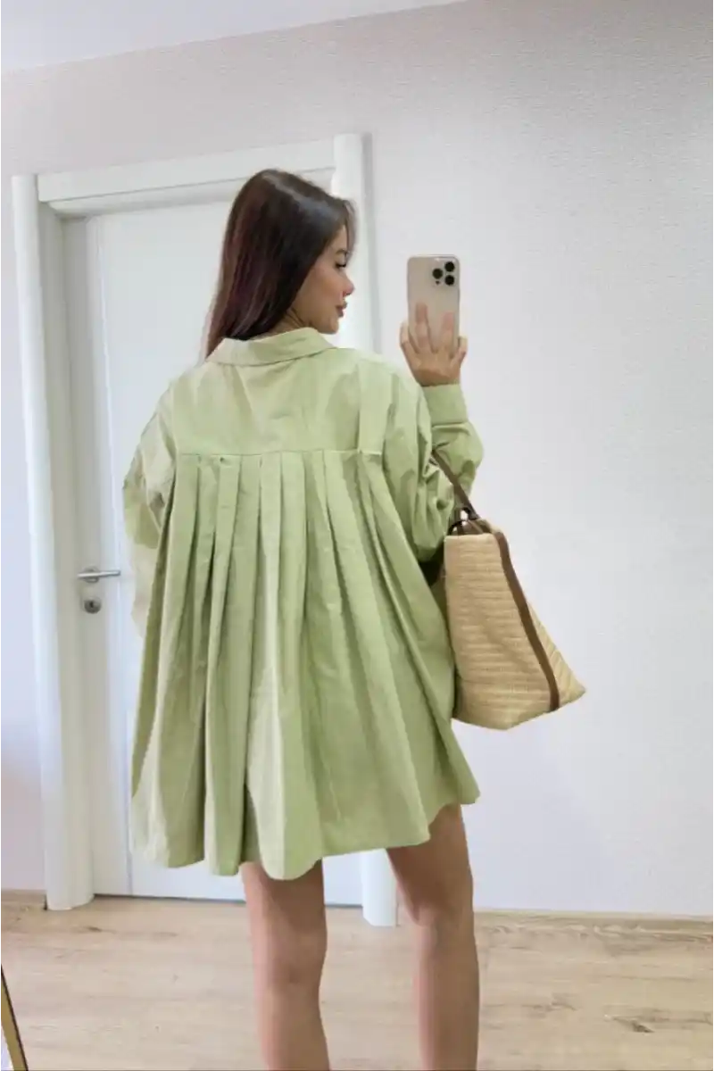 Poplin Kadın Yakalı Yandan Yırtmaçlı Arka Pens Detaylı Gömlek - Yeşil