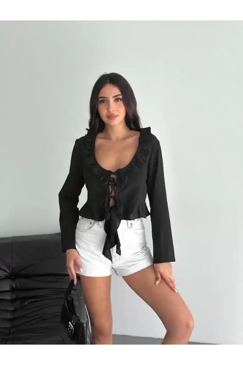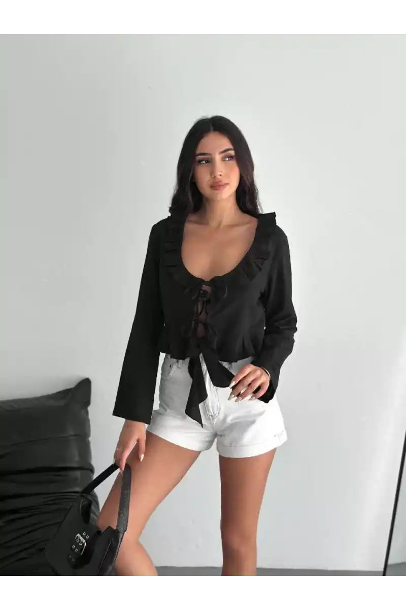 Keten Uzun Kol Bağacık Detaylı Bluz - Siyah