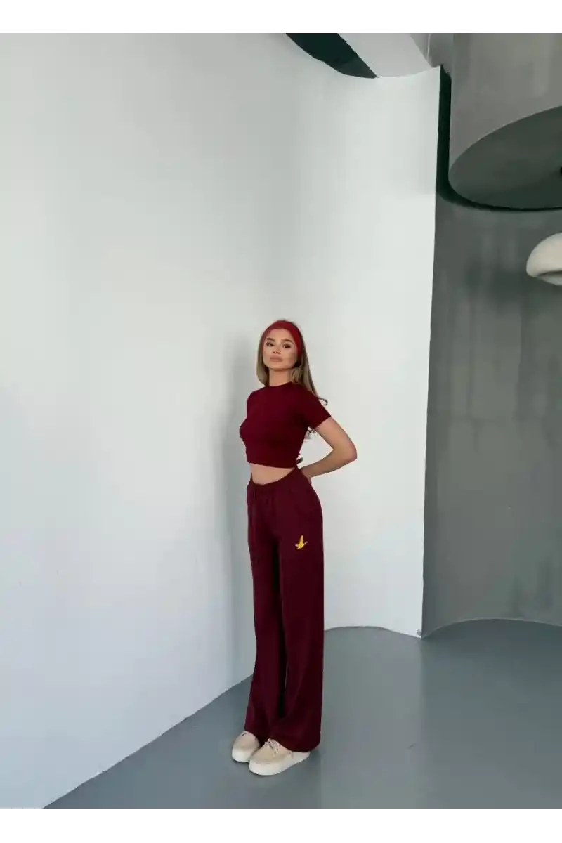 Osy Modal Yumuşak Dokulu Kumaş Nakış işlemeli Rahat Bol Paça Eşofman Pantalon - Bordo