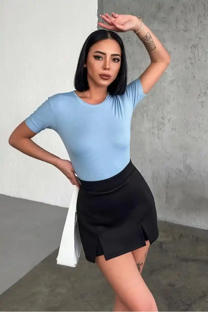 -Şimdi, gardırobunuzun en dikkat çekici parçalarından biri olmaya aday bu kısa kollu bisiklet yaka likralı bebe mavisi viskon penye body'yi hemen satın alın ve her zaman rahat ve şık bir görünüme sahip olun!