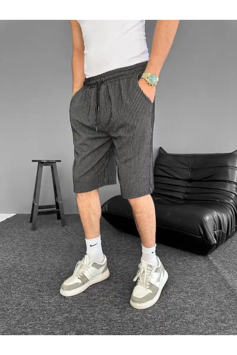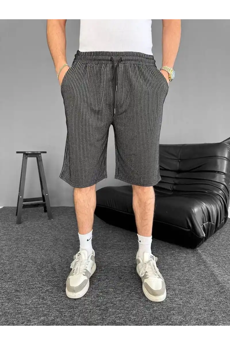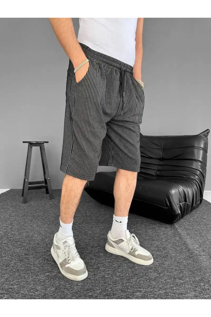 Su Yolu Çizgili Ön Arka Cepli Şort Yazlık Nefes Alabilir - Siyah