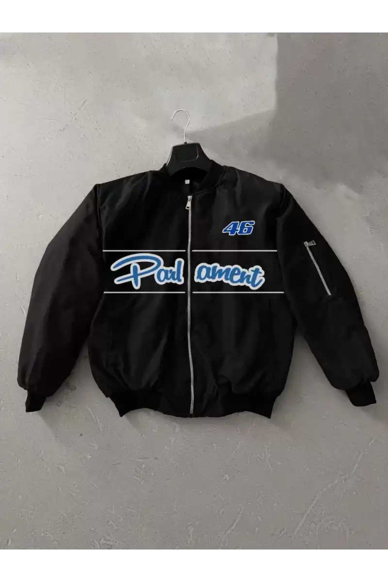 Kadın Siyah Bomber Mont – Parliament Yazılı, Fermuarlı Cepli, Kapitone Astarlı Oversize Günlük Mont - Siyah