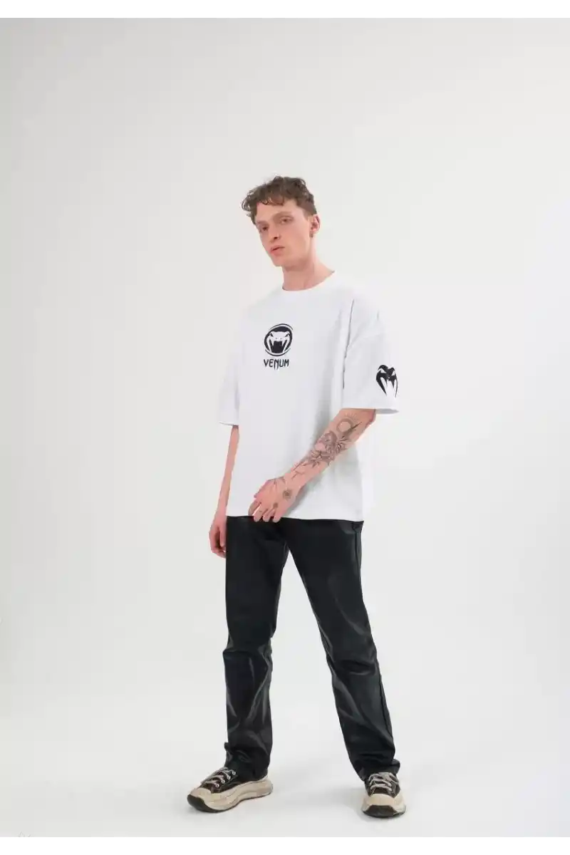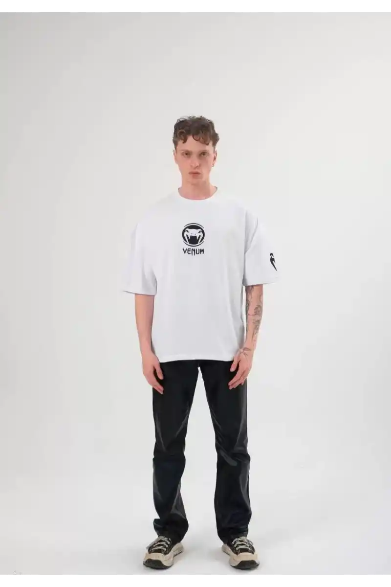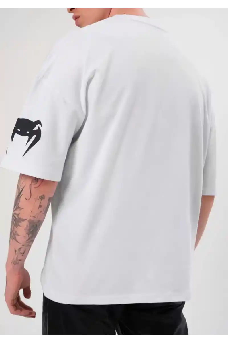 Unisex Bisiklet Yaka Baskılı Oversize T-Shirt - Beyaz