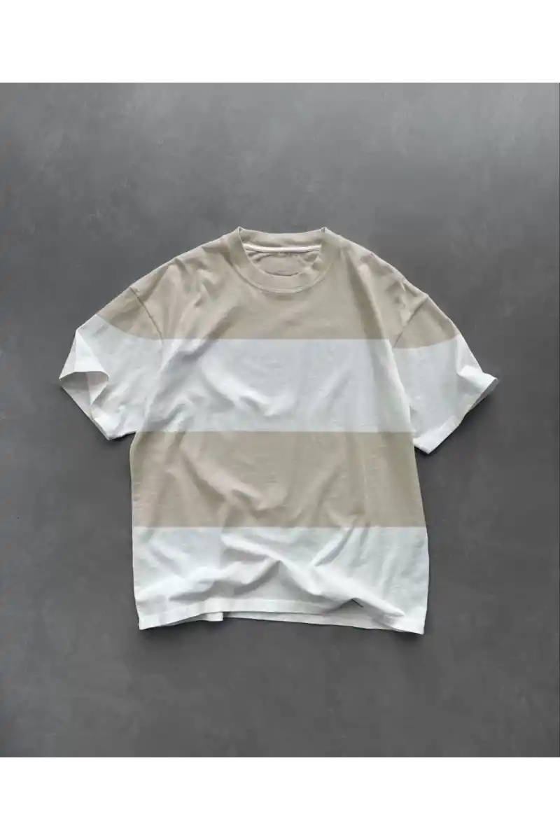 Unisex Bisiklet Yaka Parçalı T-Shirt - Bej