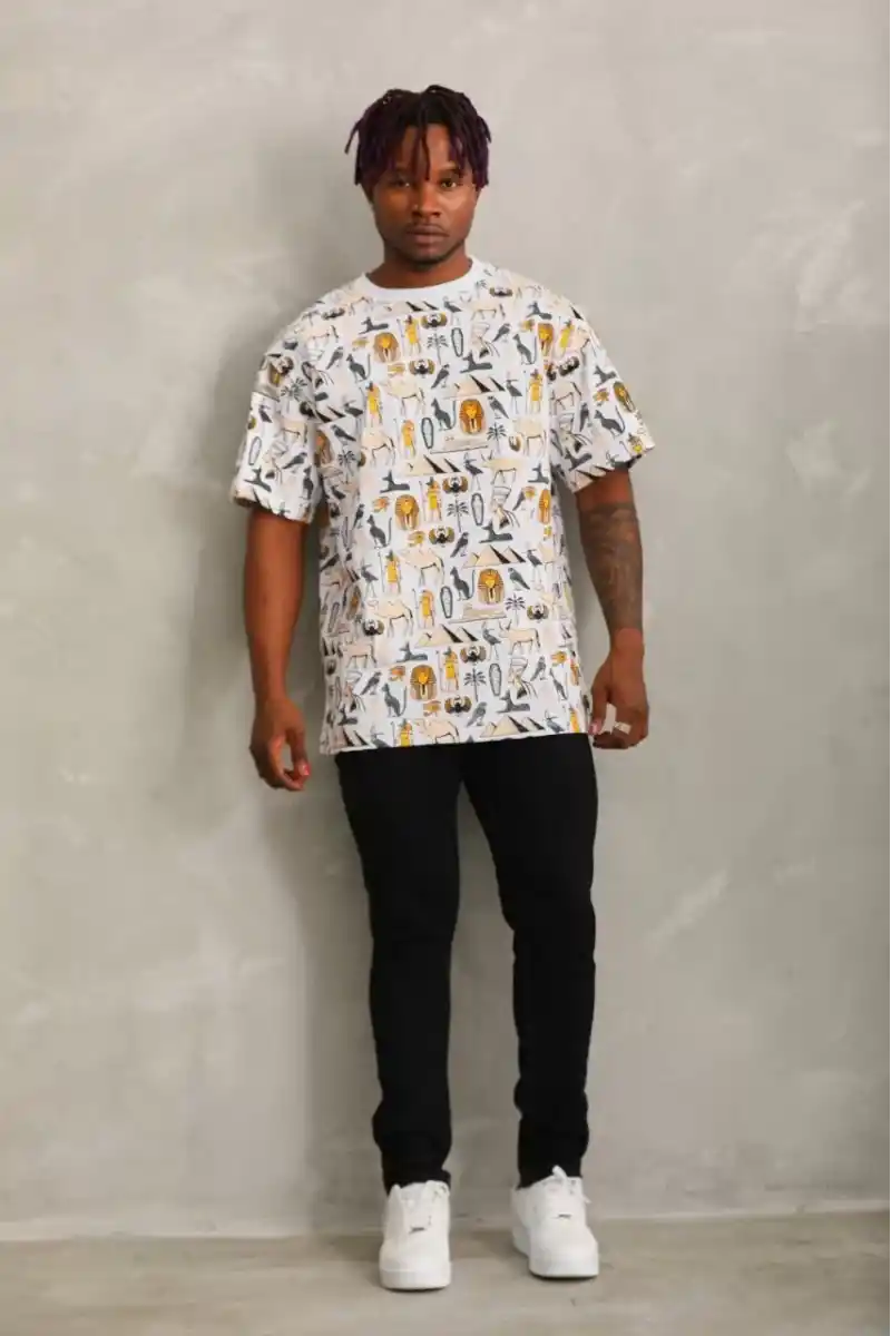 Unisex Oversize Baskılı Bisiklet Yaka T-Shirt - Beyaz
