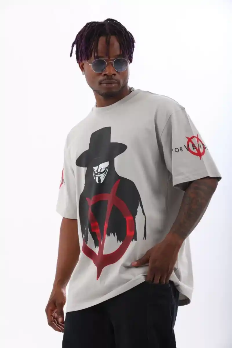 Unisex Oversize Baskılı Bisiklet Yaka T-Shirt - Gri