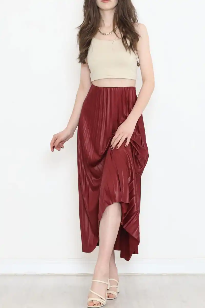 -Pileli parlak krep gizli lastikli bordo etek, modern ve zarif bir tarzı bir araya getirerek dikkat çeken bir giyim parçasıdır. Bu etek, pileli detayları ve özel kumaşıyla şıklığı ön plana çıkarırken aynı zamanda konforlu bir giyim deneyimi sunar.