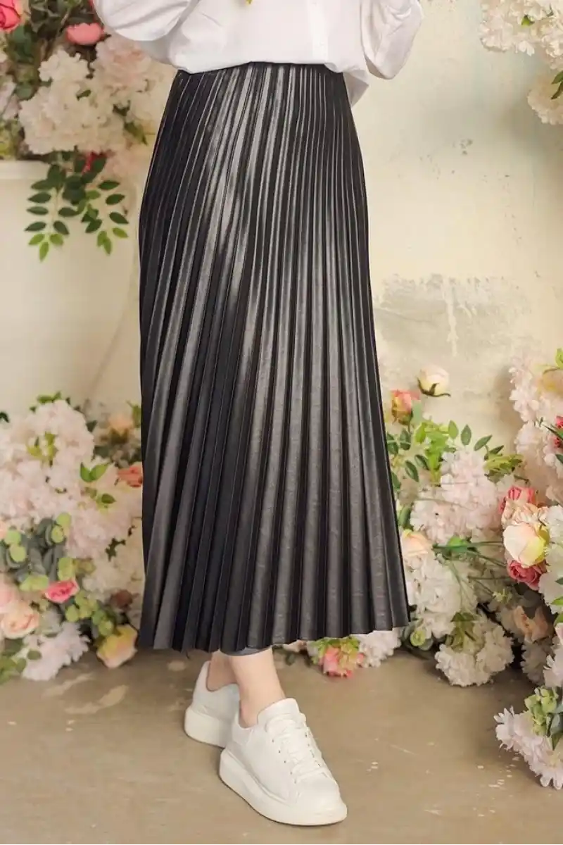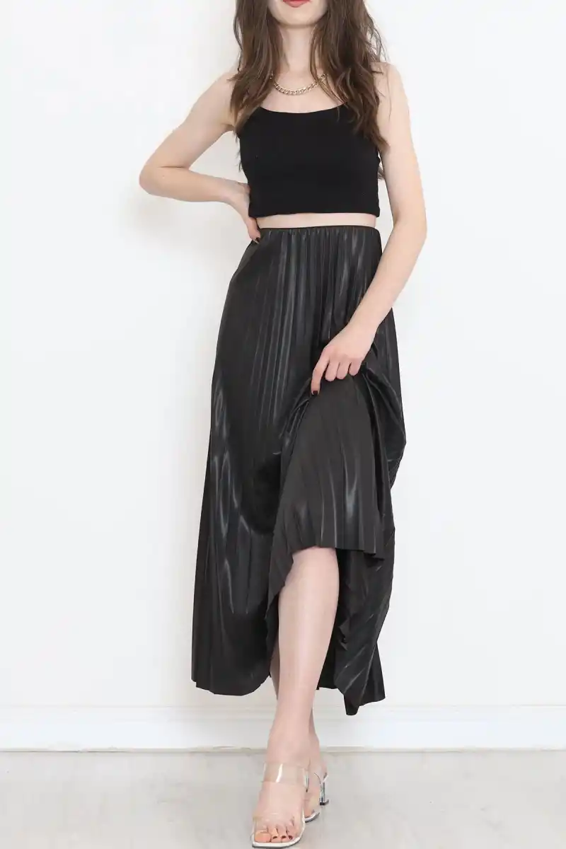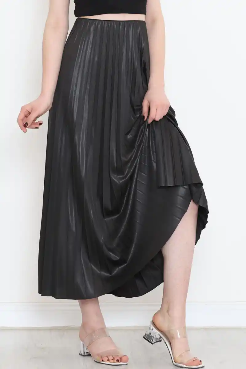 Zarif ve Modern Pileli Parlak Krep Gizli Lastikli Siyah Etek