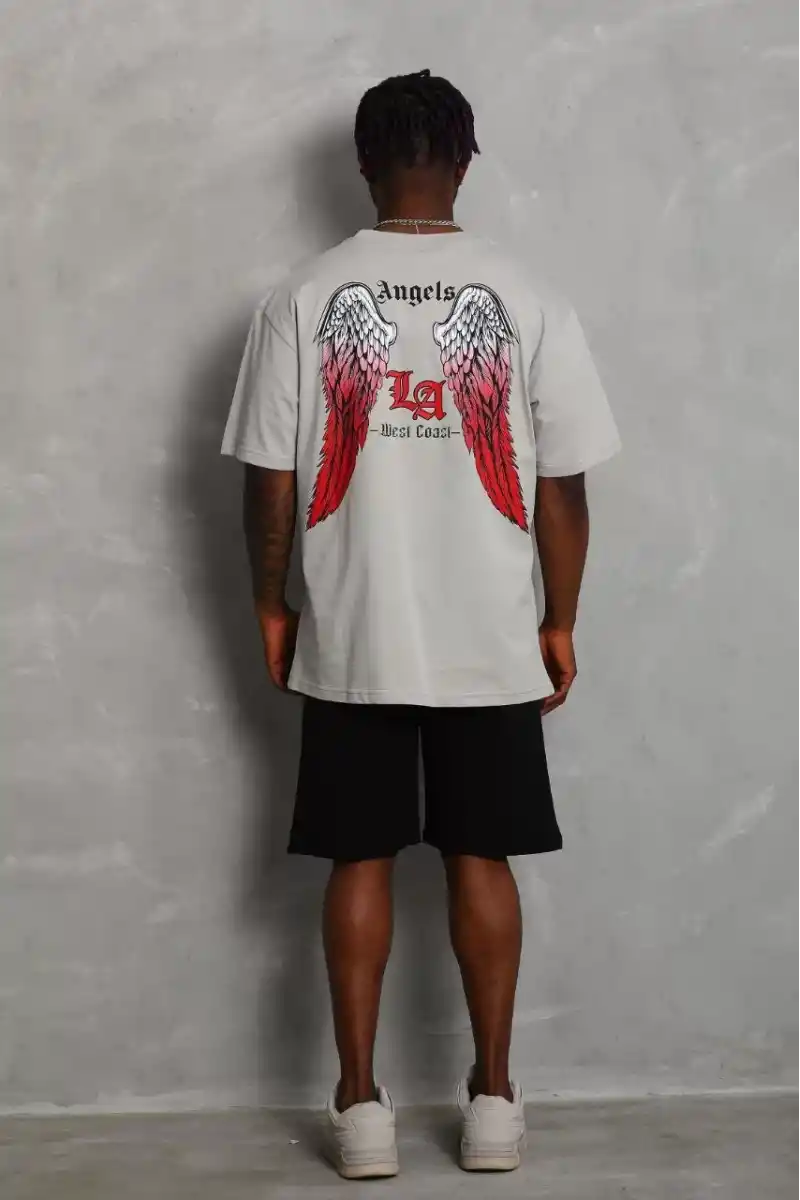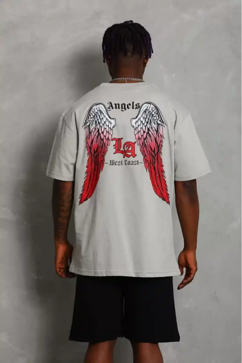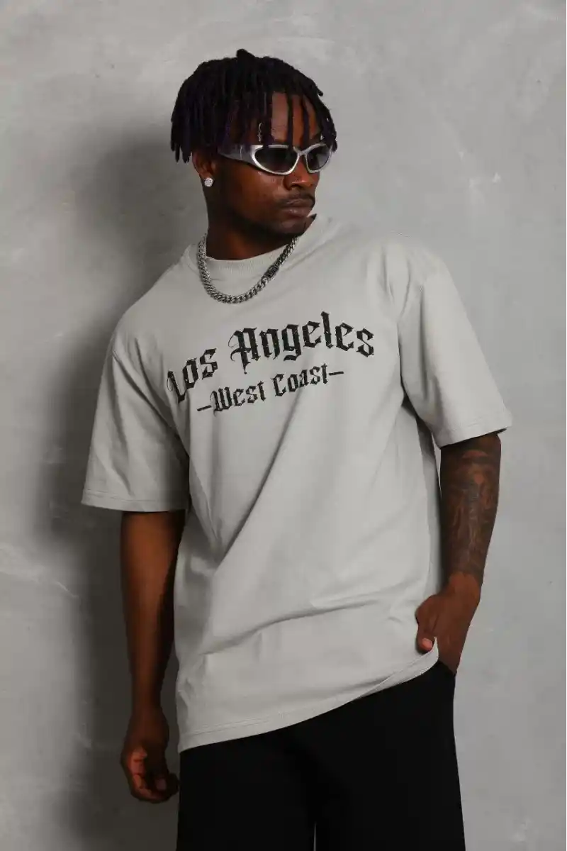 Unisex Oversize Baskılı Bisiklet Yaka T-Shirt - Gri