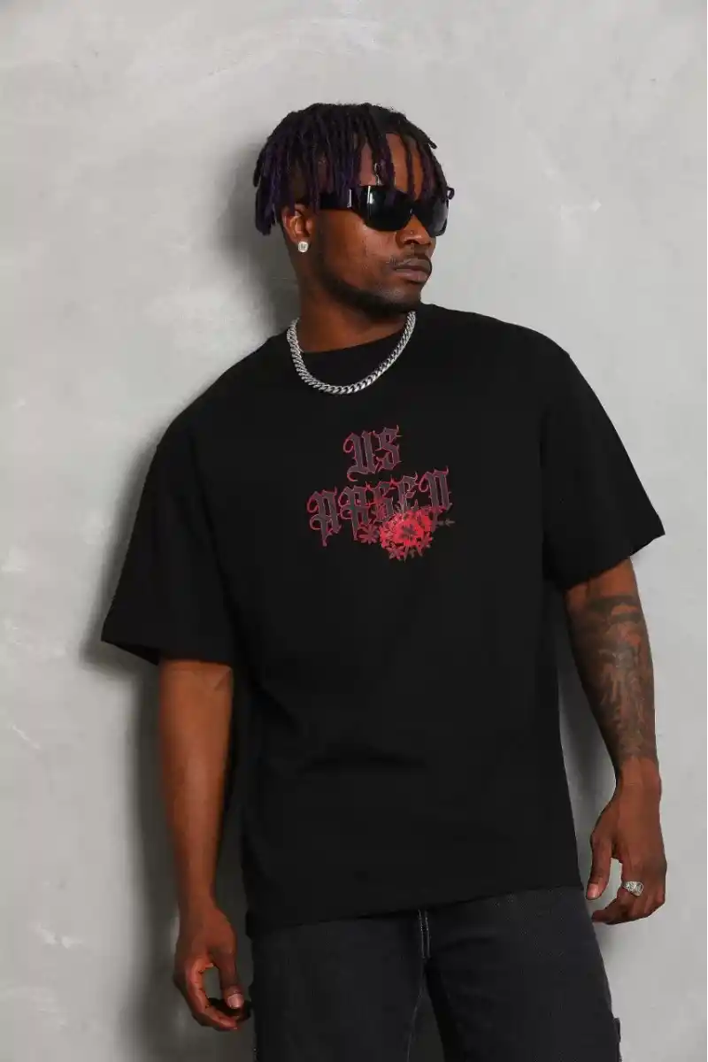 Unisex Oversize Baskılı Bisiklet Yaka T-Shirt - Siyah