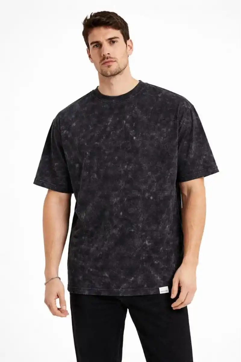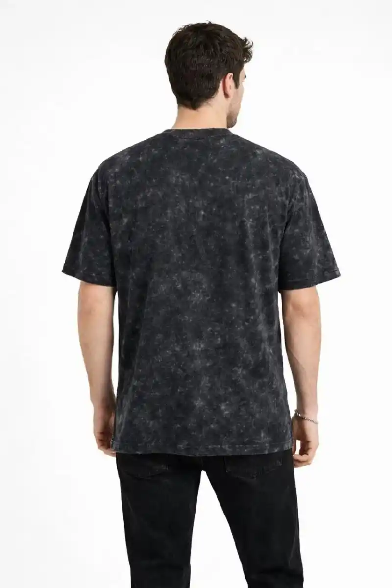 Erkek Asit Yıkama Bisiklet Yaka Kısa Kollu Oversize T-Shirt Tişört - Siyah