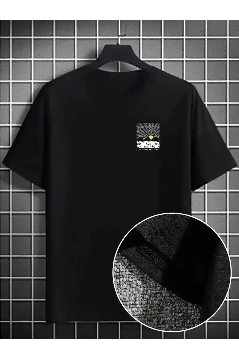 Erkek Dağ Grafikli Tişört, Yaz için Büyük Beden Rahat T-shirt - Siyah