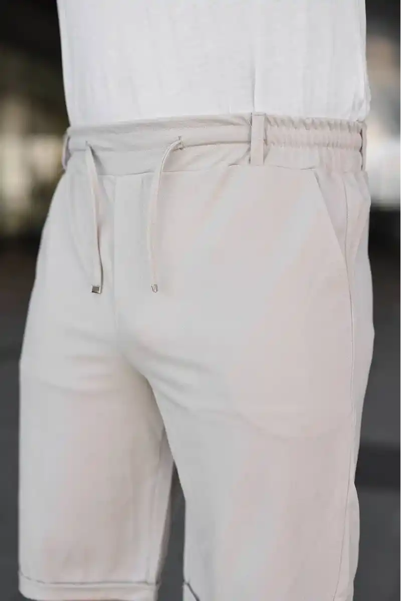 Erkek Diagonel Kumaş Duble Paça Cepli Bağcıklı Bel Lastikli ŞORT - Krem