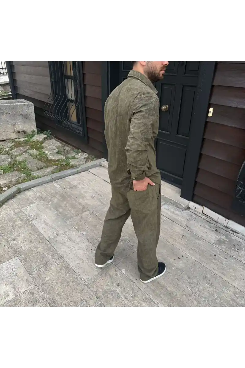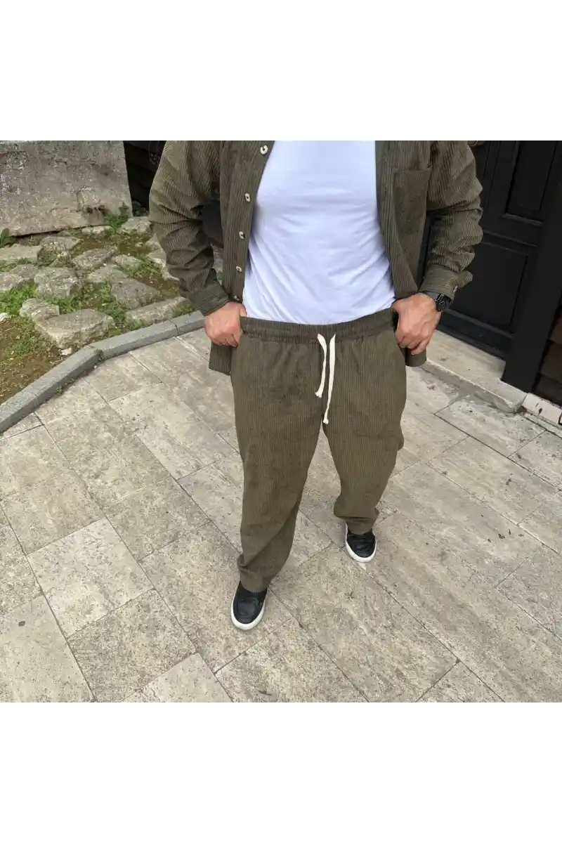Erkek Fitilli Kadife Cepli Buggy Pantolon Oversize Rahat Kalıp - Haki
