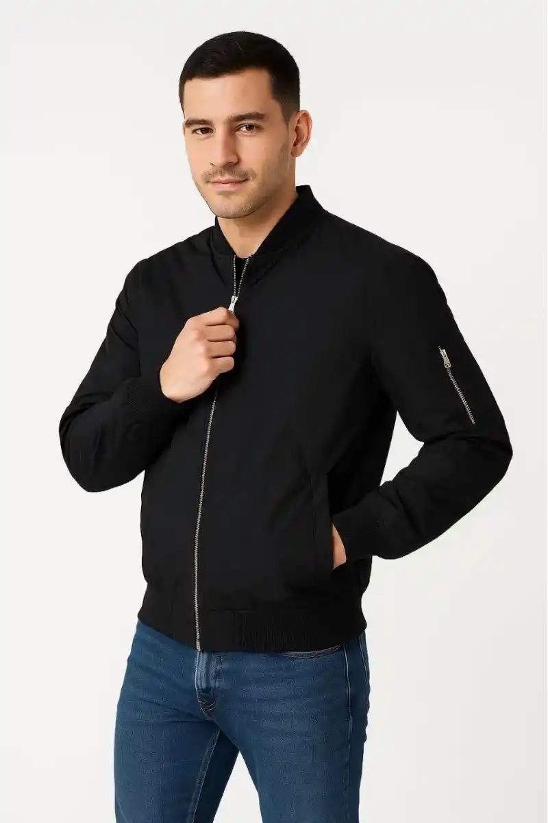 Erkek Bomber Mont Ceket – Fermuarlı, Kapitone İçi Astarlı, Su İtici Kumaş, Regular Fit, Uzun Kollu, Yandan Cepli, Bahar & Kış Rahat Günlük Stil - Siyah