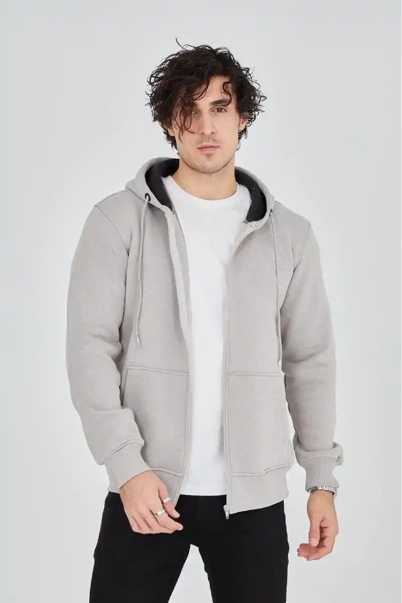 Erkek Kapüşonlu Düz Fermuarlı Hırka - Boyalı Gri