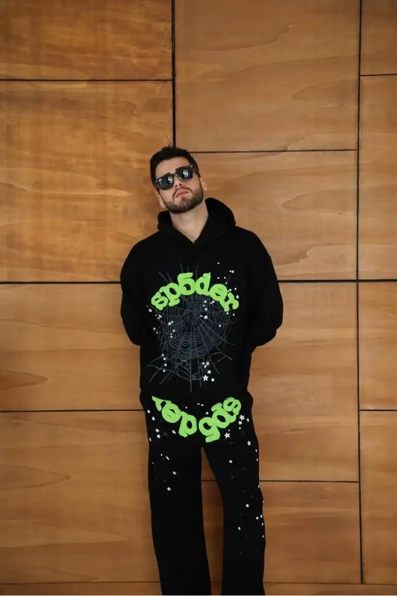 Erkek Kapüşonlu Eşofman Takım Örümcek Ağı ve Neon Yeşil Baskılı Kanguru cepli Oversize Rahat Kalıp, Premium Üç İplik Kumaş - Siyah