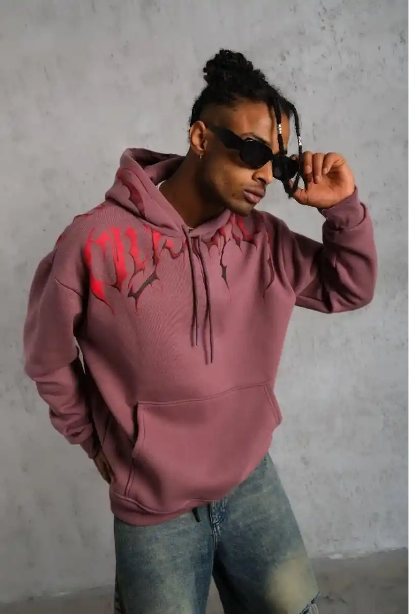 Erkek Ön ve Arka Baskılı Kapüşonlu 3 İplik Sweatshirt - Gül Kurusu