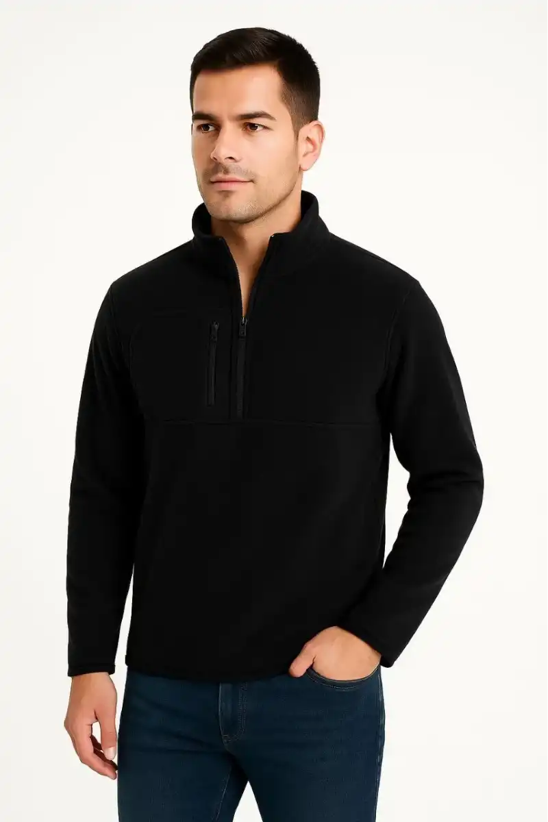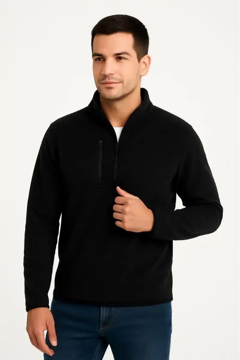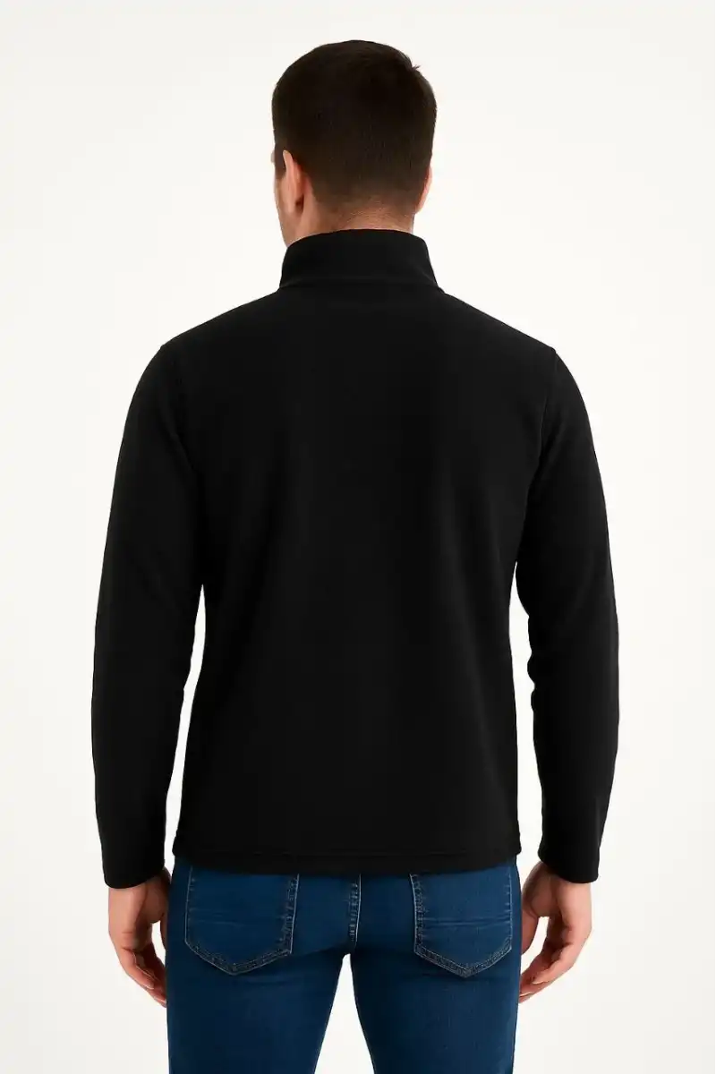 Erkek Polar Kazak – Dik Yaka, Yarım Fermuarlı, Fermuarlı Göğüs Cepli, Siyah Biyeli, Kışlık Rahat Regular Fit Günlük Model - Siyah